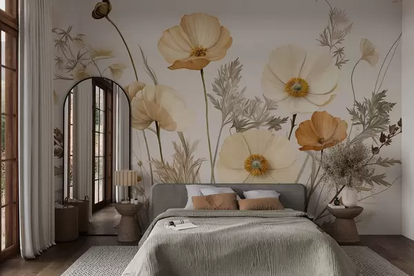 Fototapeter Oransje og hvite vintage valmuer med tynne stilker og blader, lys beige bakgrunn, akvarellstil Nr. w09293