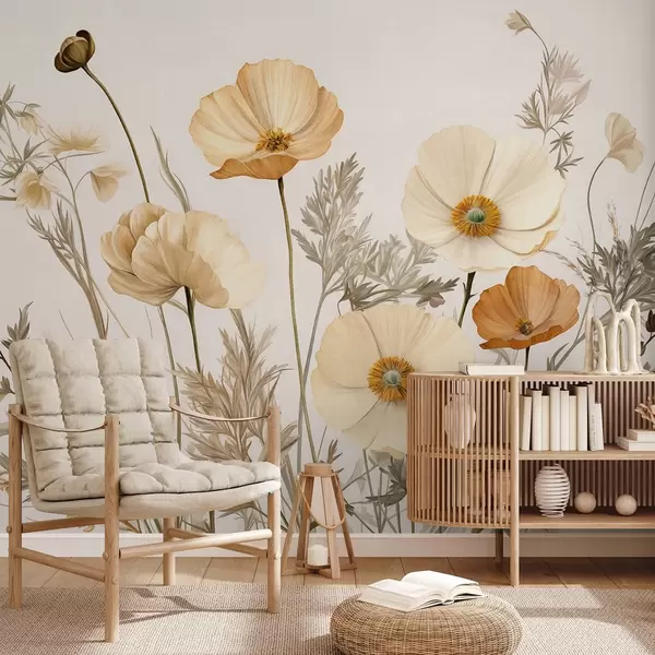 Fototapeter Oransje og hvite vintage valmuer med tynne stilker og blader, lys beige bakgrunn, akvarellstil Nr. w09293