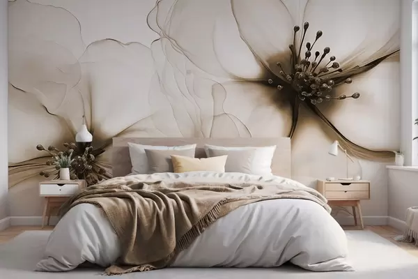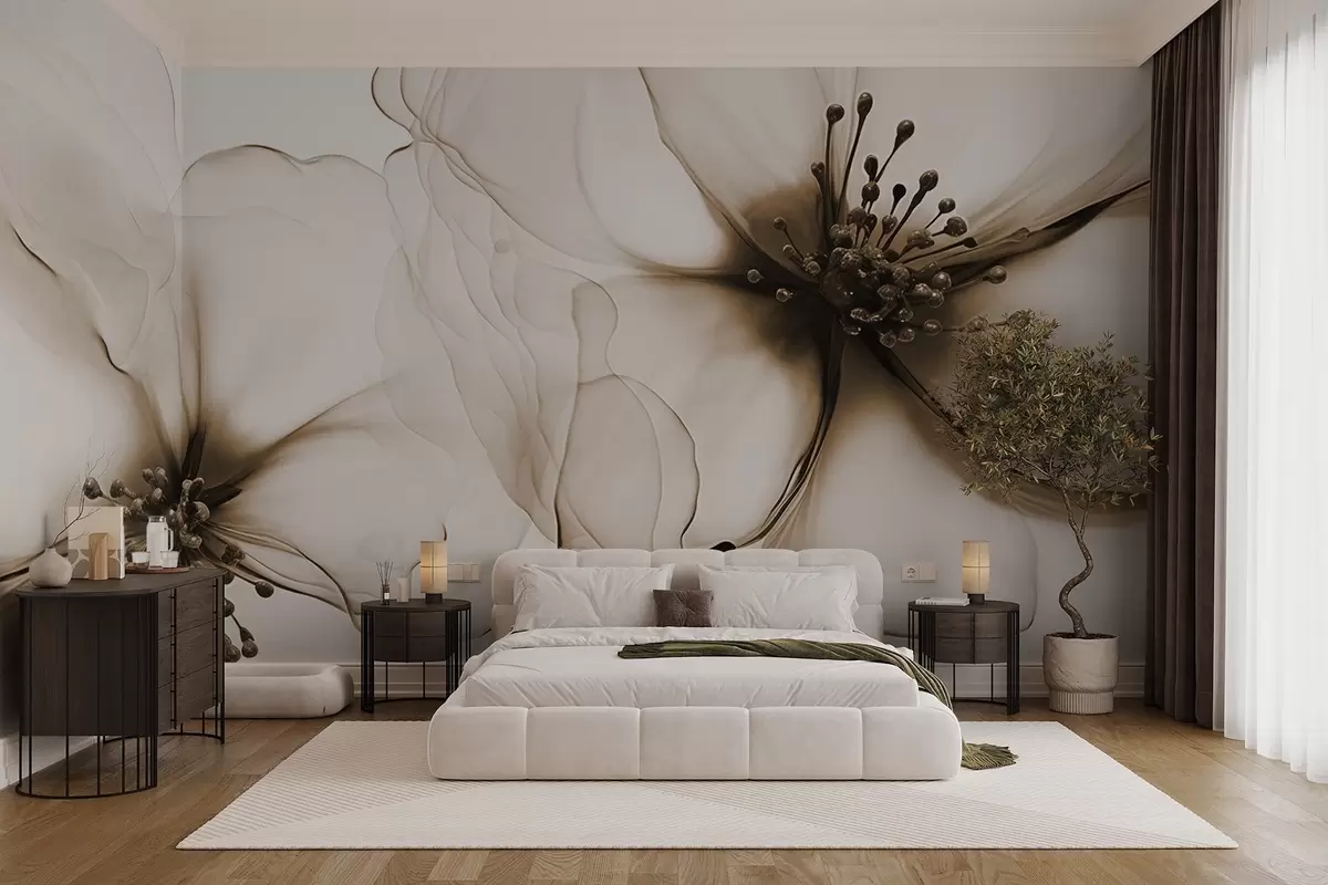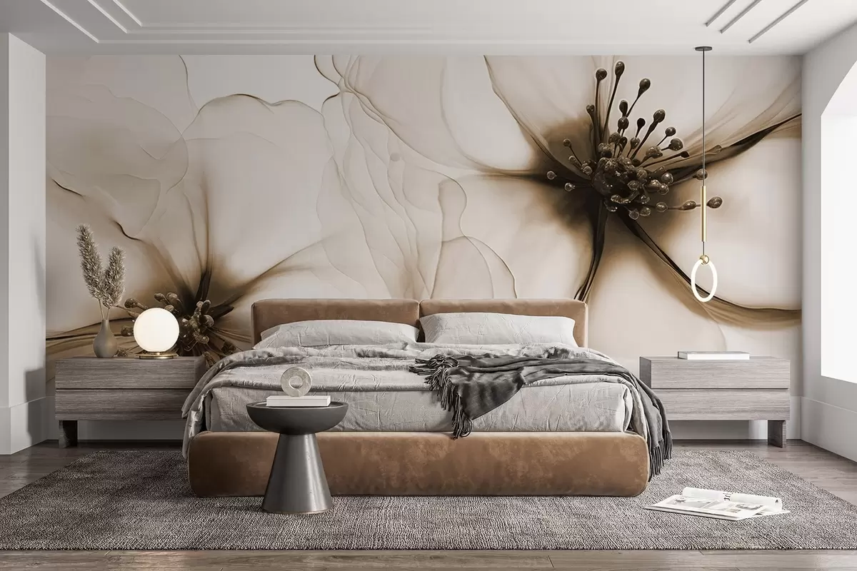 Fototapeter To gjennomskinnelige, brune blomster med synlige støvdragere, overlappende, delikate kronblader og en myk, flytende tekstur Nr. w09295