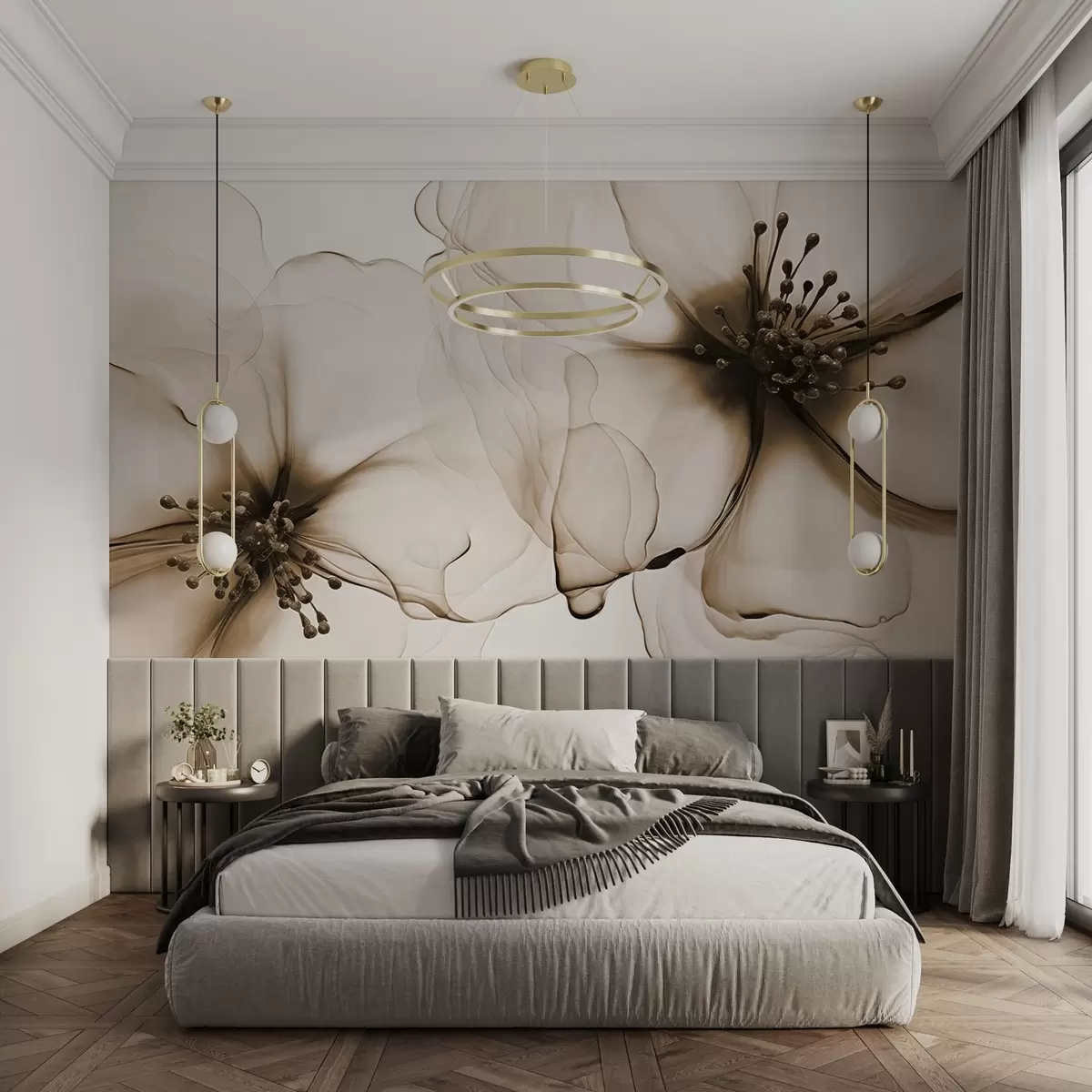 Fototapeter To gjennomskinnelige, brune blomster med synlige støvdragere, overlappende, delikate kronblader og en myk, flytende tekstur Nr. w09295
