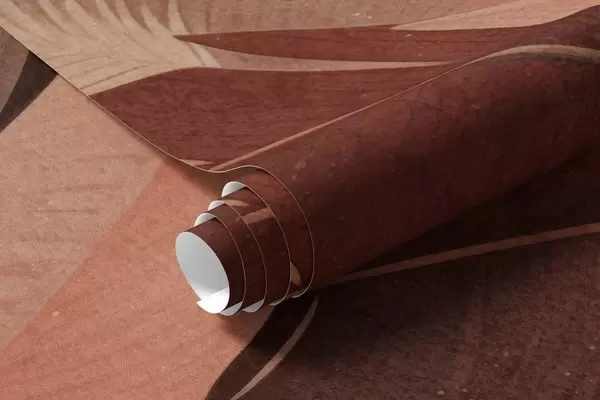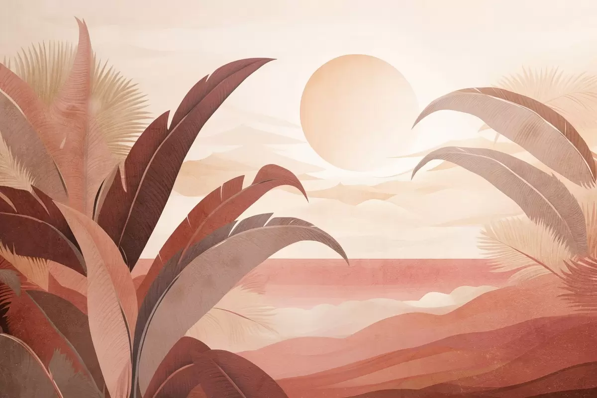 Fototapeter Tropisk teksturert abstrakt landskap med palmeblader og en stor sol på himmelen, varm fargepalett, minimalistisk stil, stilisert Nr. w09296