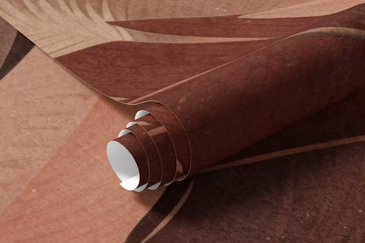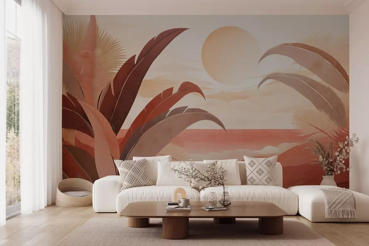 fototapeter Tropisk teksturert abstrakt landskap med palmeblader og en stor sol på himmelen, varm fargepalett, minimalistisk stil, stilisert w09296
