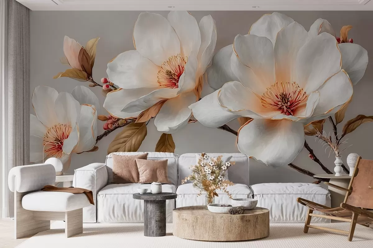 Fototapeter Delikate blomster på en gren i pastellfarger med oransje midtpunkt Nr. w09299