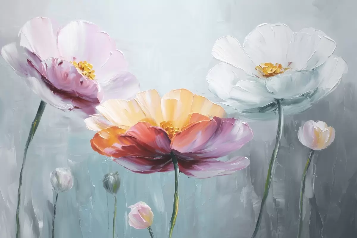 Fototapeter Lyse blomster i oljemaleriteknikk på blå bakgrunn Nr. w09310