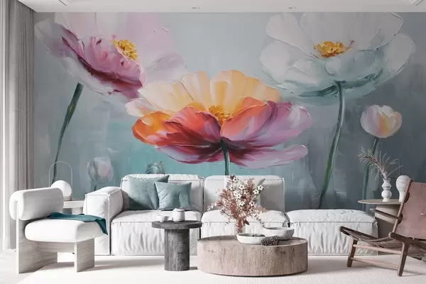 Fototapeter Lyse blomster i oljemaleriteknikk på blå bakgrunn Nr. w09310