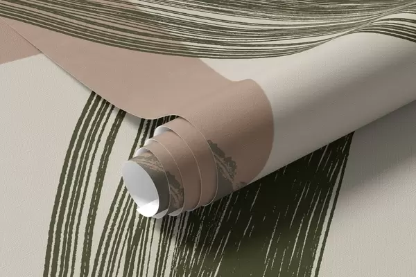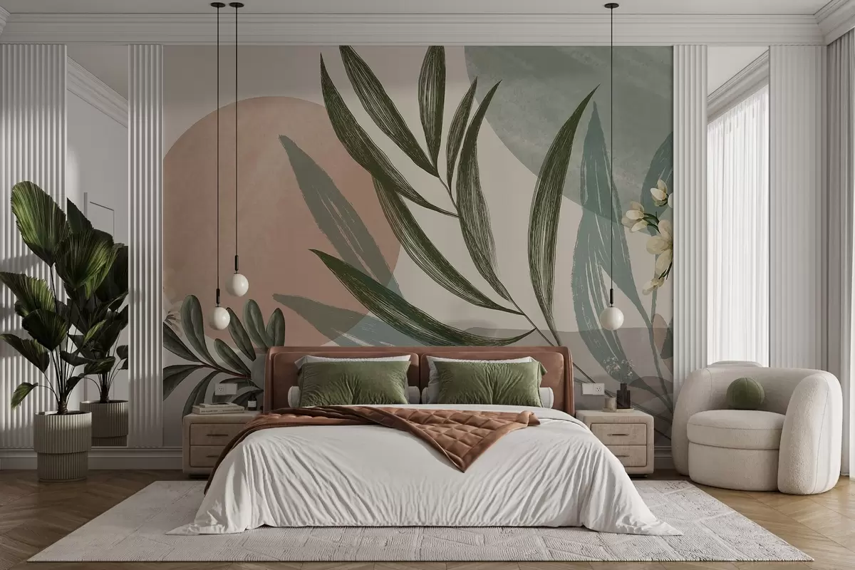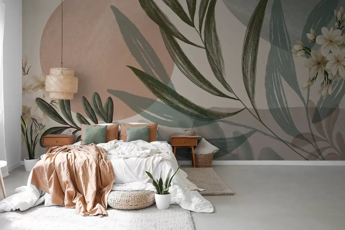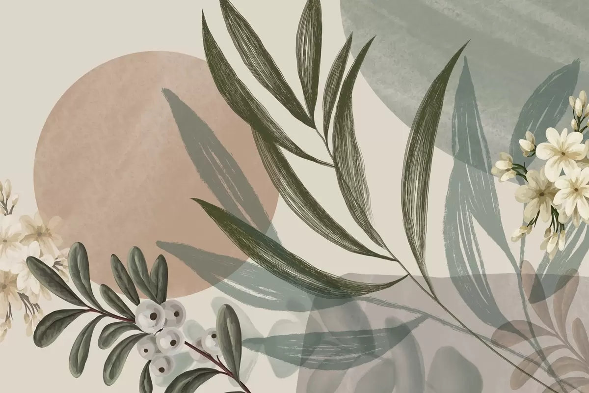Fototapeter Abstrakt botanisk kunst med grønne palmeblader og hvite bær, mot en bakgrunn av former i dempede jordfarger Nr. w09312