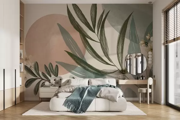 Fototapeter Abstrakt botanisk kunst med grønne palmeblader og hvite bær, mot en bakgrunn av former i dempede jordfarger Nr. w09312