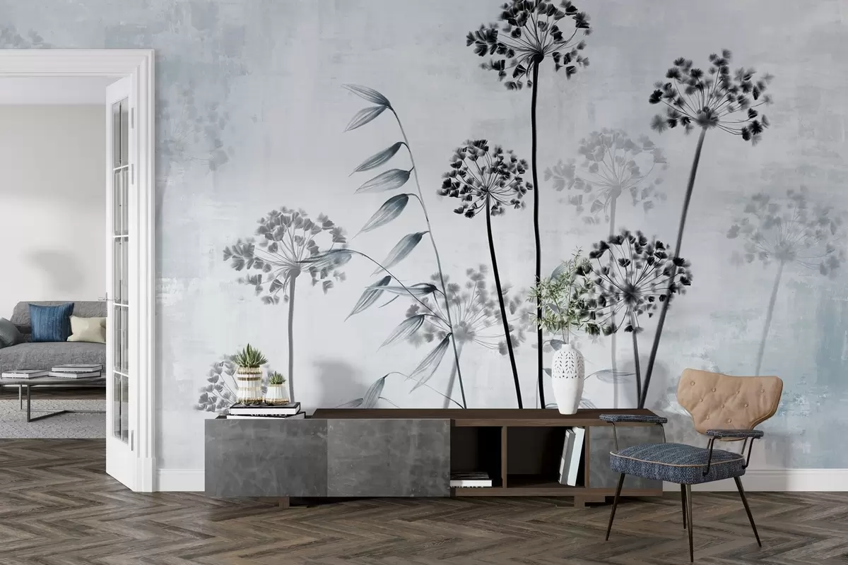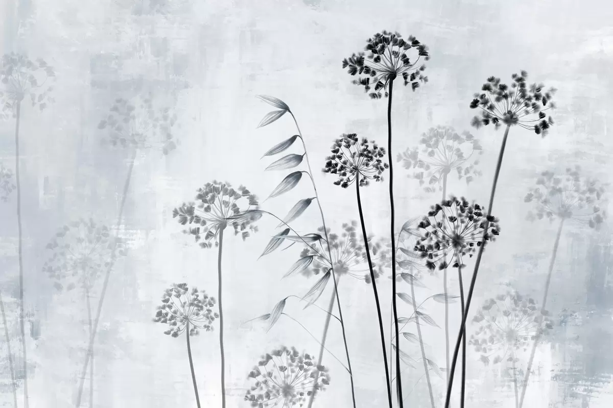 Fototapeter Tegning av tørkede blomster med lange stilker, monokrom palett, mot en strukturert, lysegrå bakgrunn, botanisk illustrasjon Nr. w09314