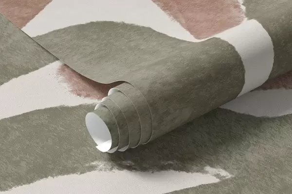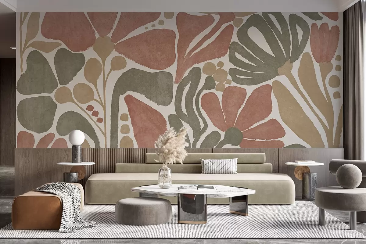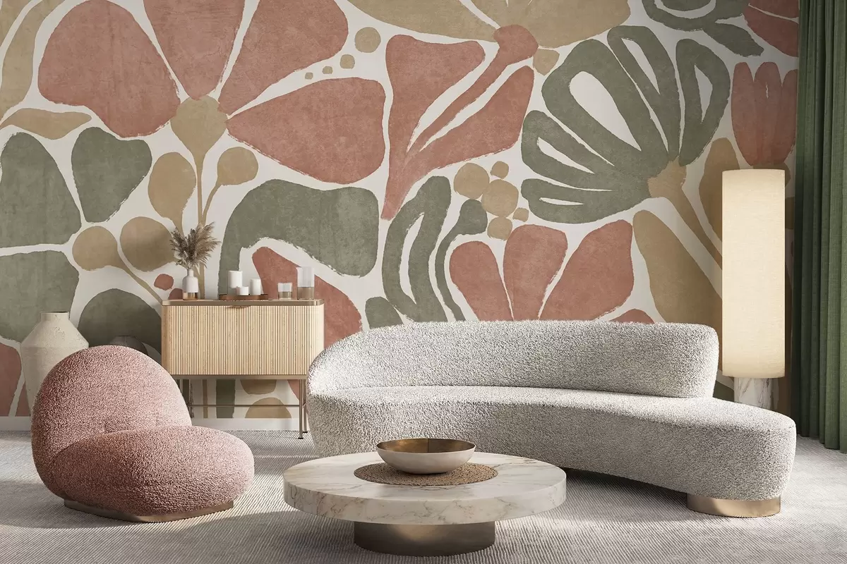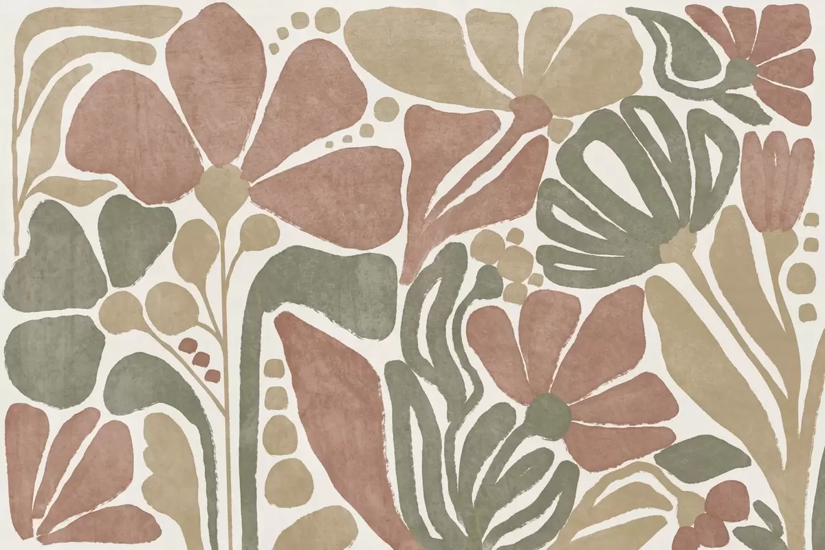 Fototapeter Abstrakte blomster i nyanser av rødt, grønt og beige, med en lys bakgrunn, i et flatt, stilisert, moderne og minimalistisk design Nr. w09315