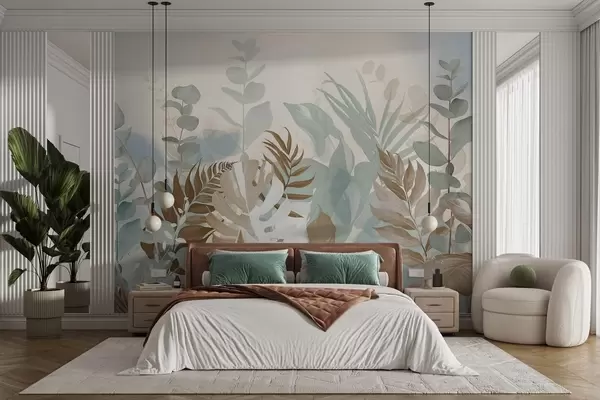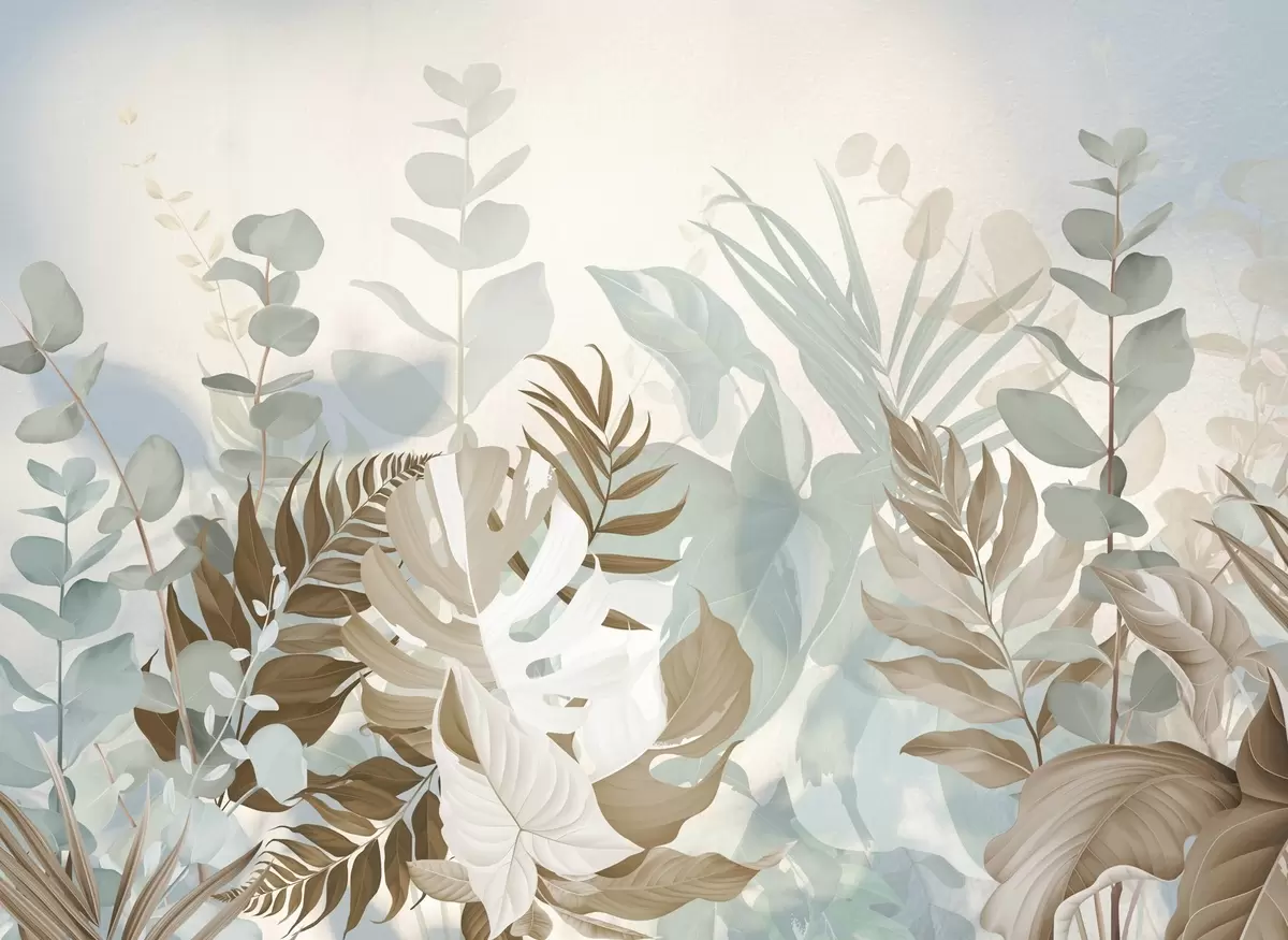 Fototapeter Pastellfargede planter, bregner, monstera og eukalyptus, lett strukturert bakgrunn, myk belysning, fredelig, botanisk illustrasjon Nr. w09316v1