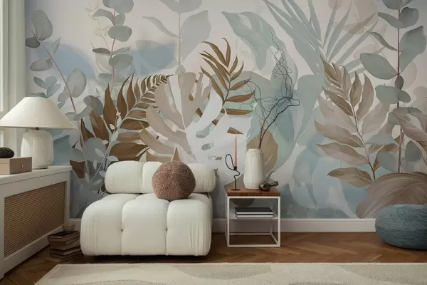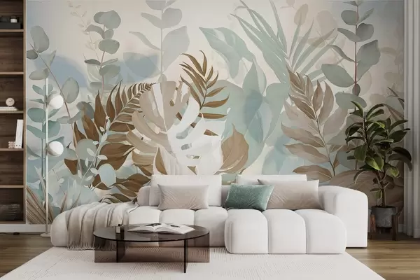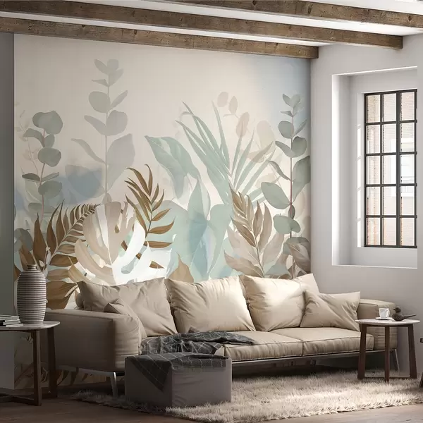 Fototapeter Pastellfargede planter, bregner, monstera og eukalyptus, lett strukturert bakgrunn, myk belysning, fredelig, botanisk illustrasjon Nr. w09316v1