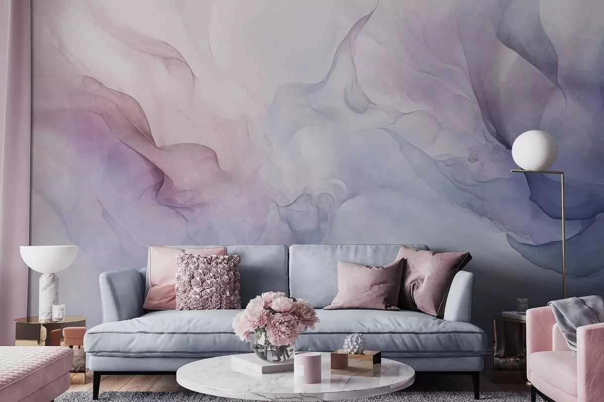Fototapeter Abstrakt, strukturert maleri med flytende pastellfarger i rosa, lilla og blått som skaper en myk effekt Nr. w09318