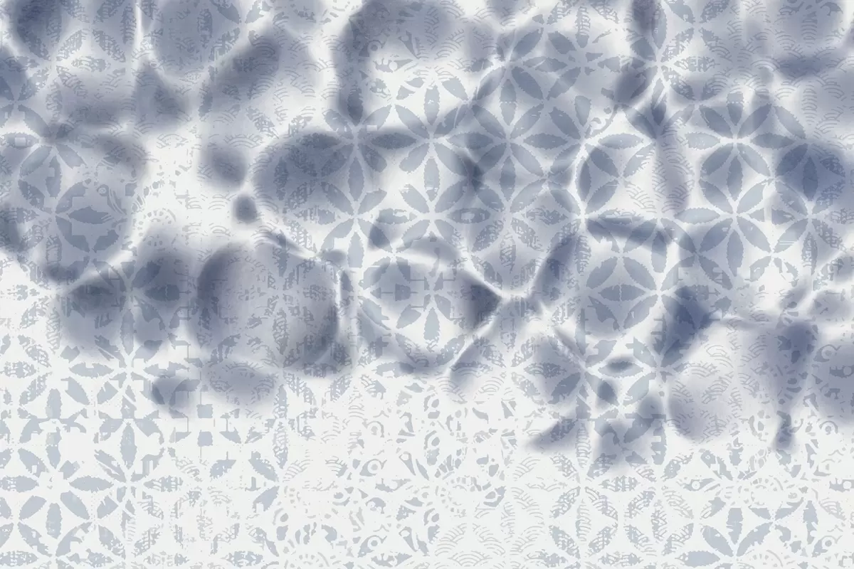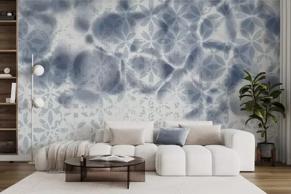 Fototapeter Abstrakt teksturert kunst med blått blomstertrykk, falmet og uskarp effekt som skaper en myk og drømmende atmosfære Nr. w09322