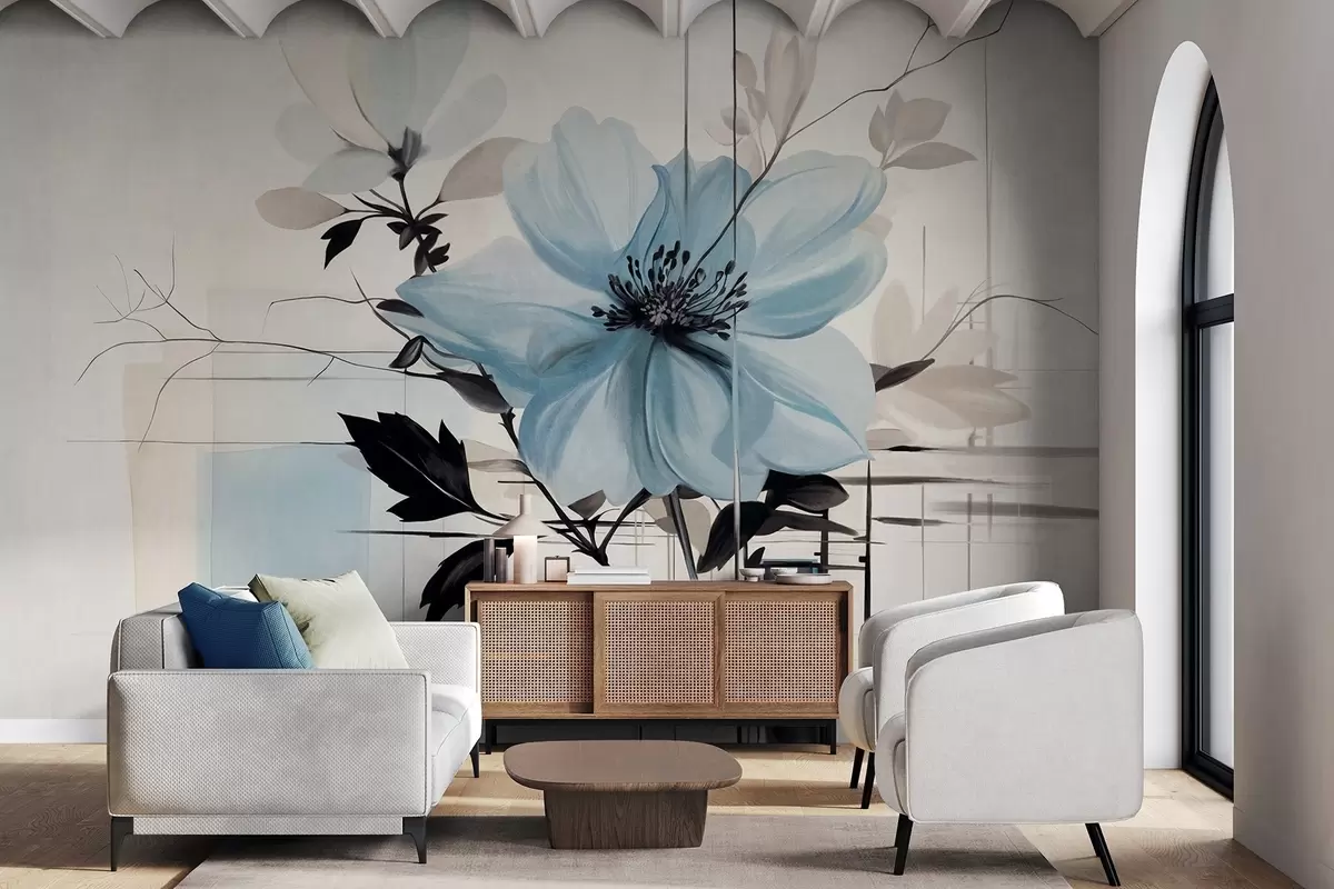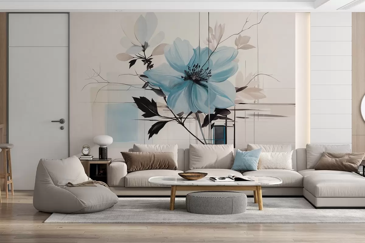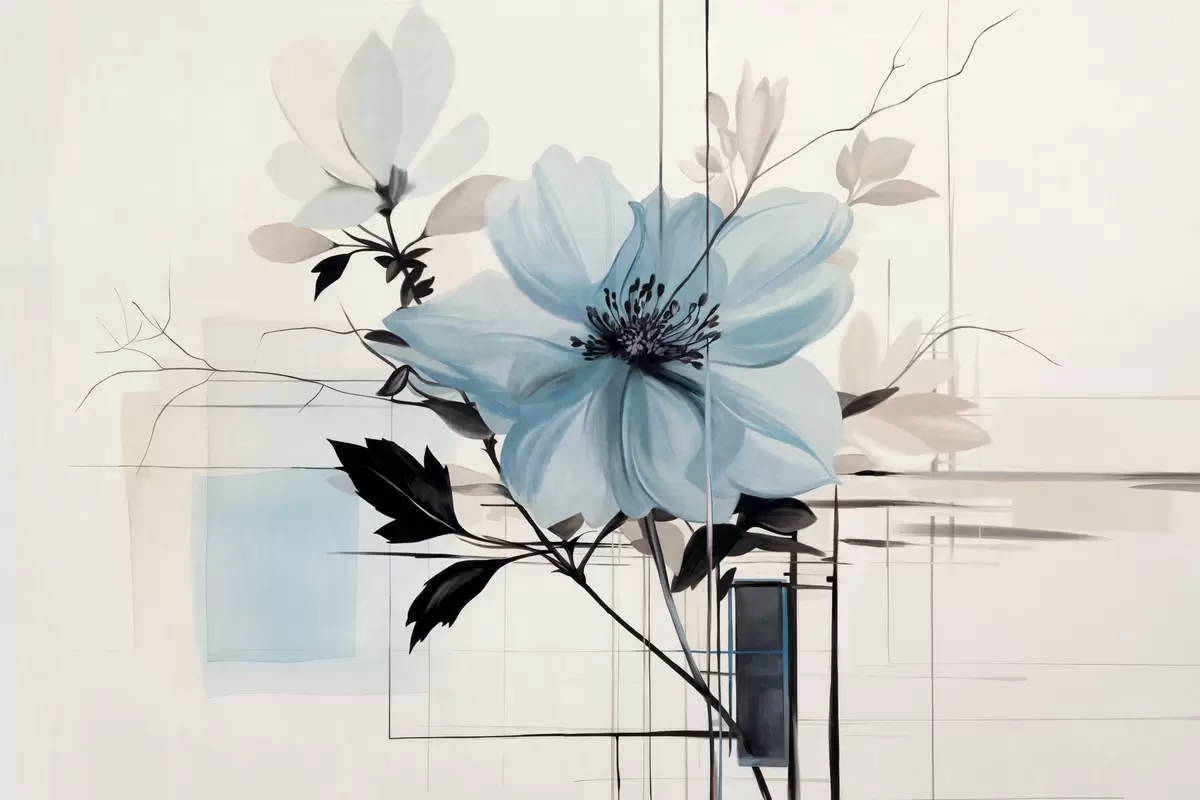 Fototapeter Abstrakt blå blomst med mørke blader og grener, geometriske minimalistiske former og linjer i dempede farger Nr. w09332