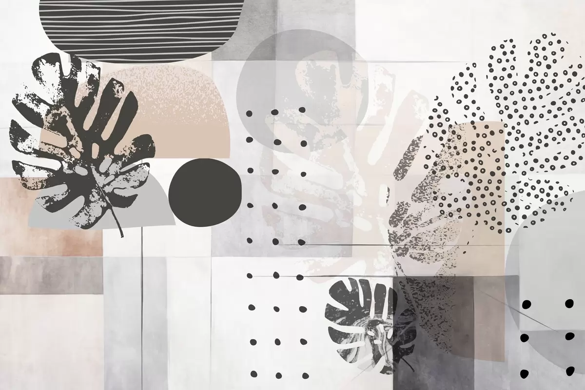 Fototapeter Abstrakt trykk med geometriske former og tropiske monstera-blader, sirkler, prikker og linjer, moderne og minimalistisk design Nr. w09333