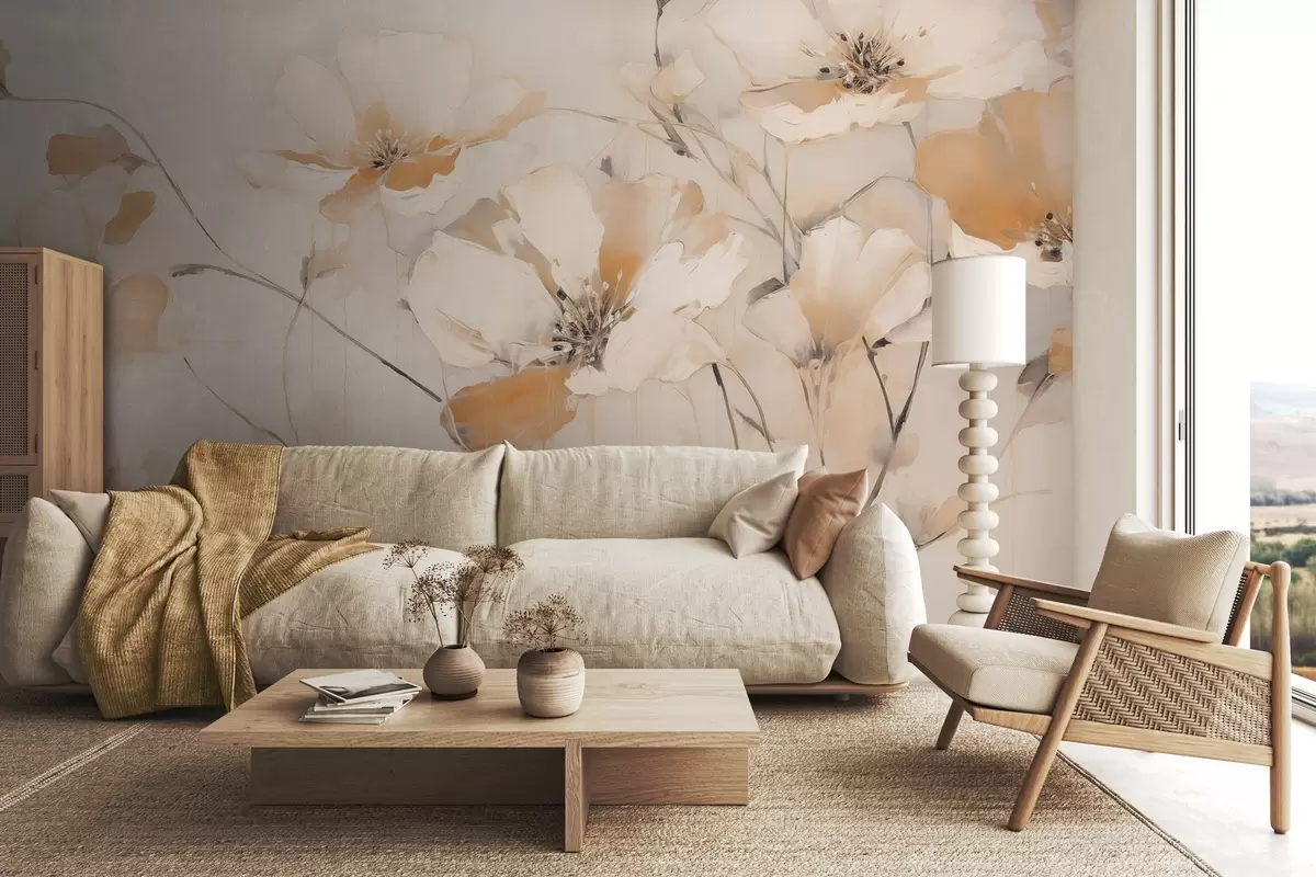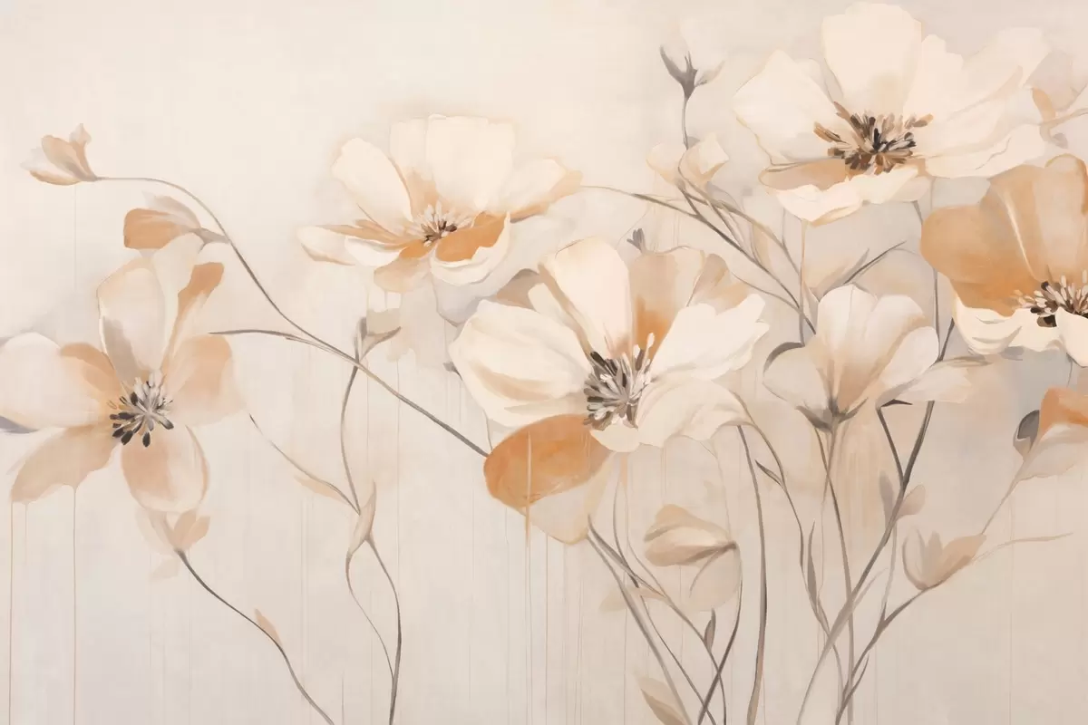 Fototapeter Hvite og oransje teksturerte blomster med lange stilker, lys bakgrunn, myke farger, elegant komposisjon, delikate penselstrøk Nr. w09335