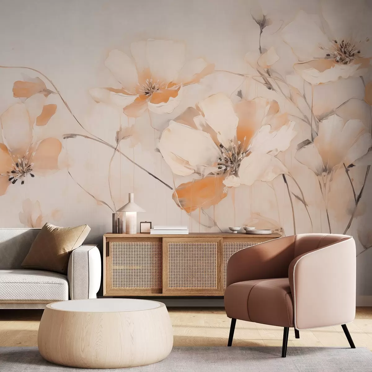 Fototapeter Hvite og oransje teksturerte blomster med lange stilker, lys bakgrunn, myke farger, elegant komposisjon, delikate penselstrøk Nr. w09335