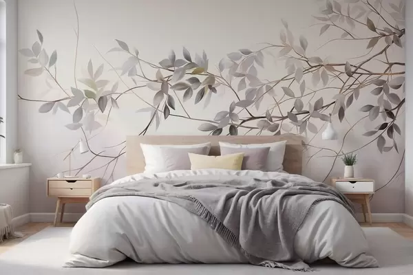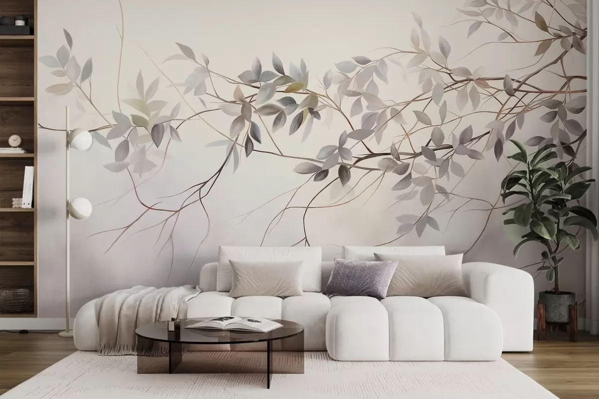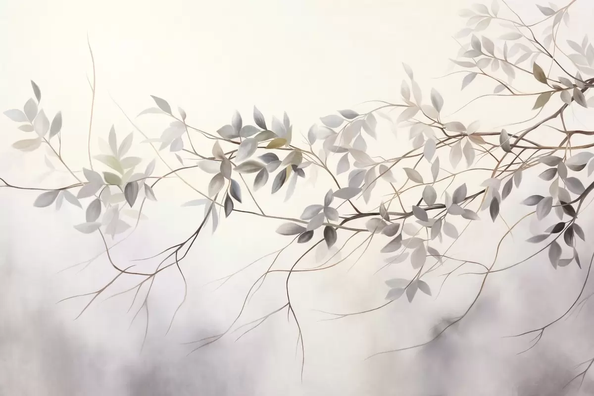 Fototapeter Delikate, strukturerte grener med dempede grå, lilla og grønne blader mot en myk, uskarp bakgrunn Nr. w09336