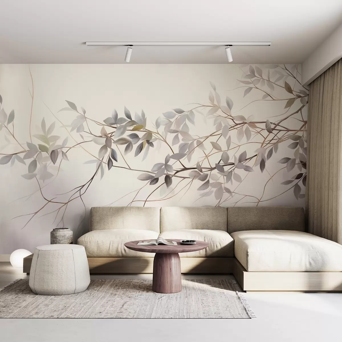 Fototapeter Delikate, strukturerte grener med dempede grå, lilla og grønne blader mot en myk, uskarp bakgrunn Nr. w09336