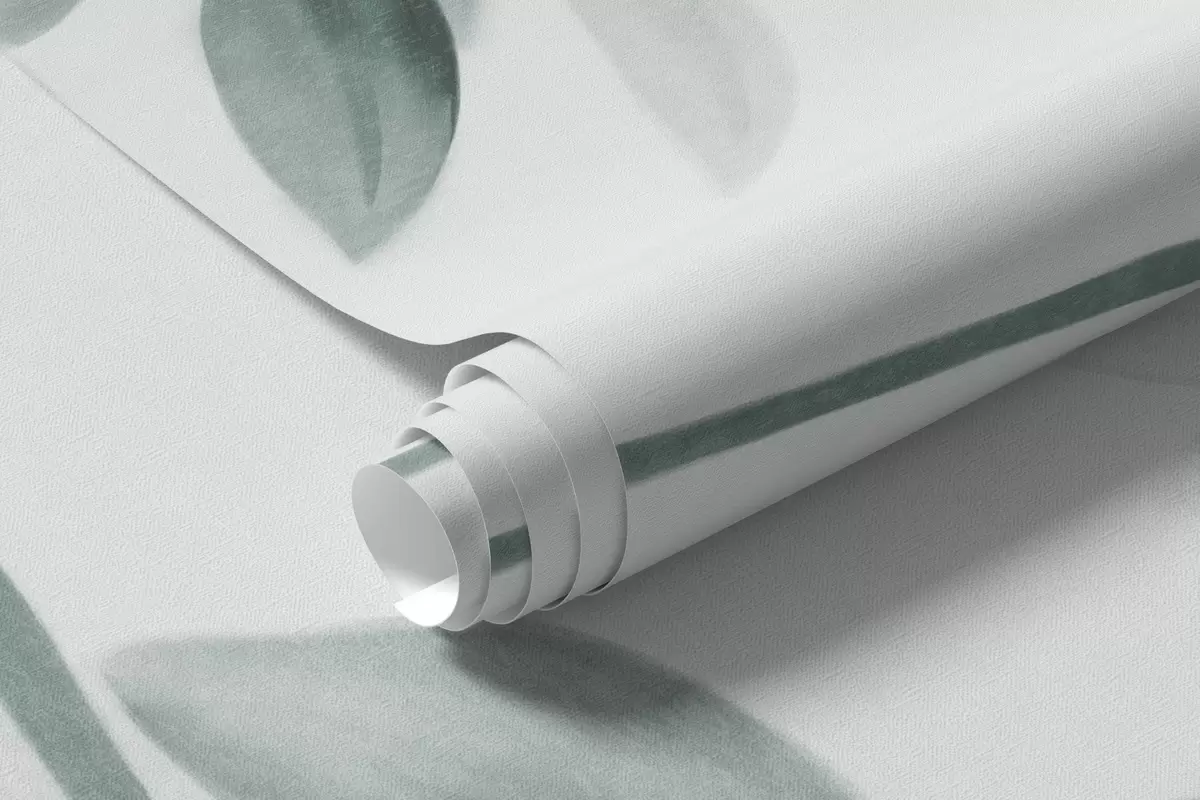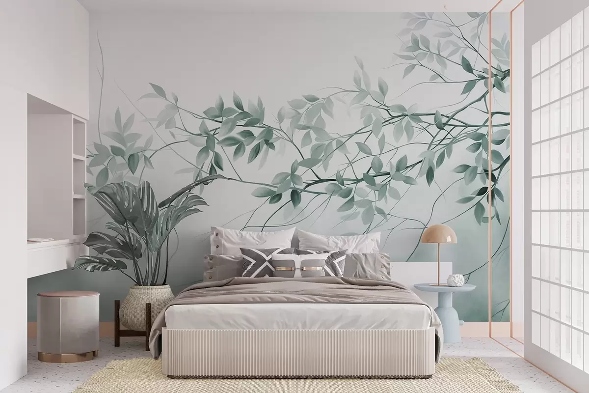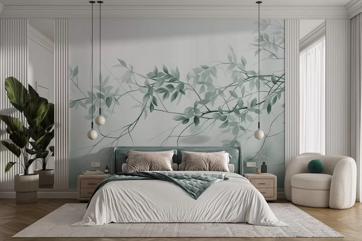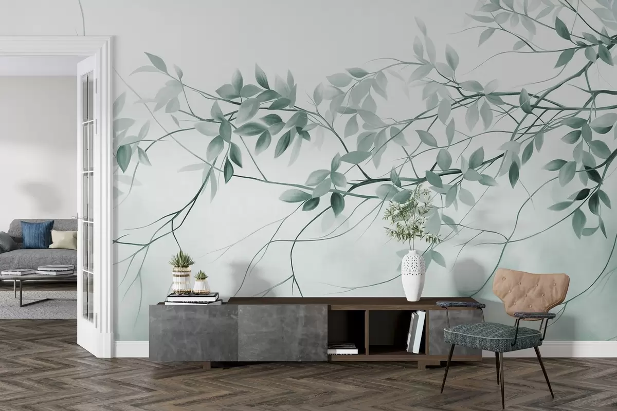 Fototapeter Delikate, strukturerte grener med dempede grå og grønne blader mot en myk, uskarp bakgrunn Nr. w09336v1