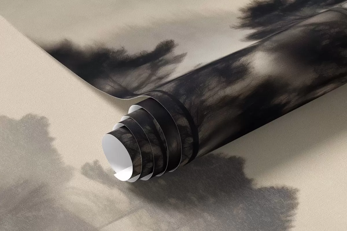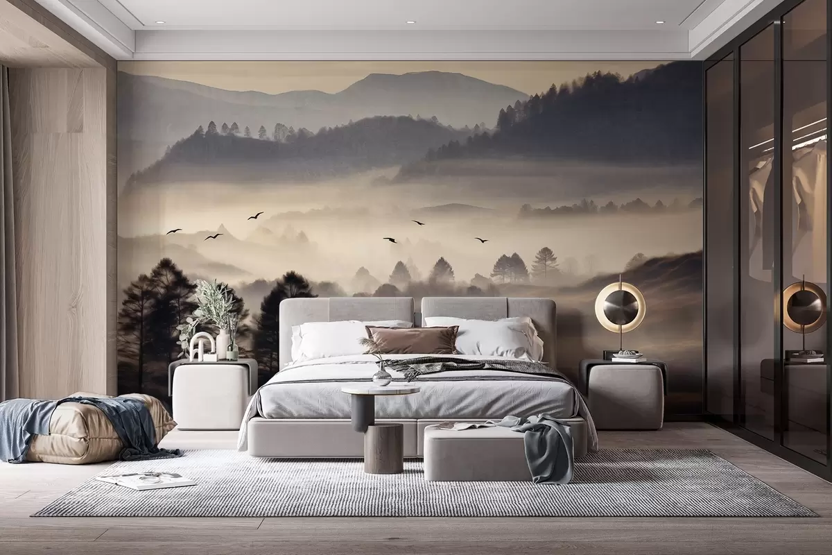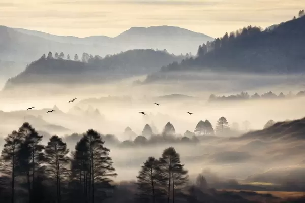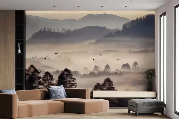 Fototapeter Strukturert fjellandskap med lag av tåke, silhuett av trær i forgrunnen, fjellkjede i det fjerne, myk belysning Nr. w09338