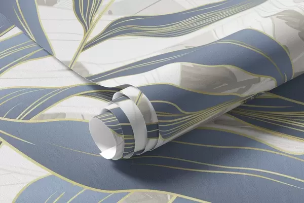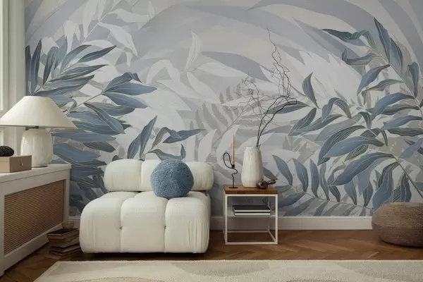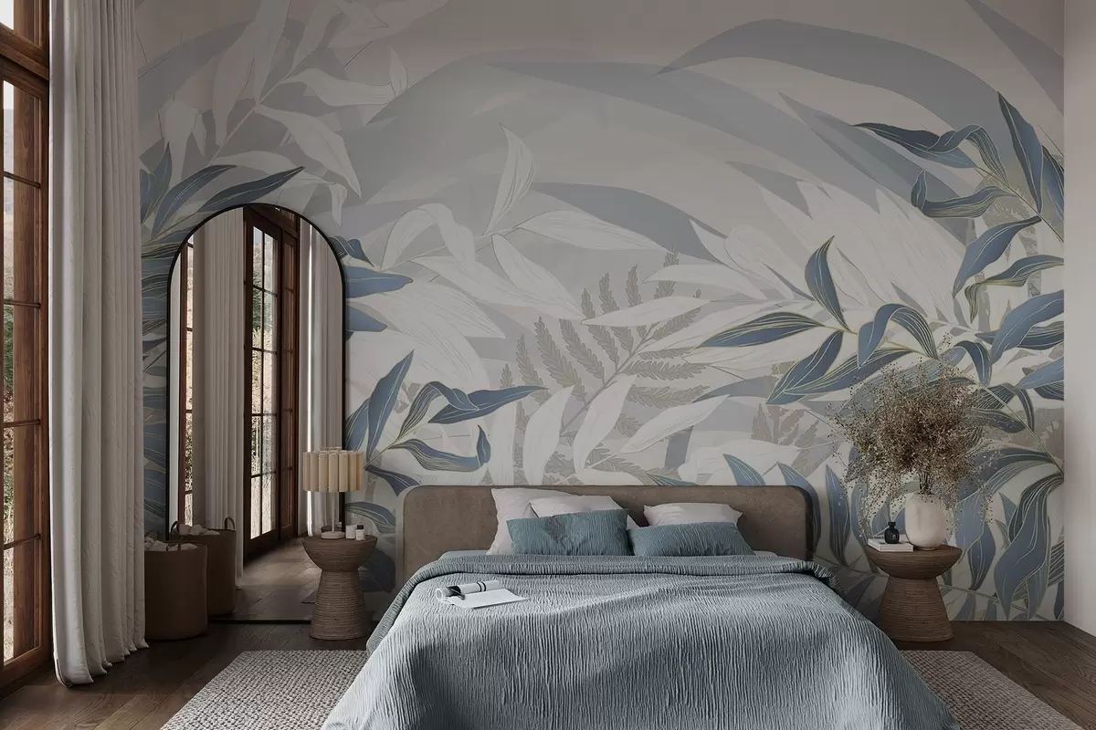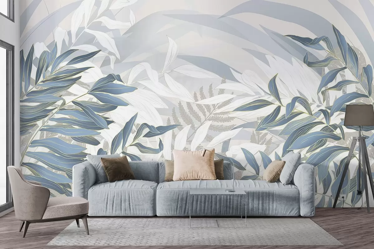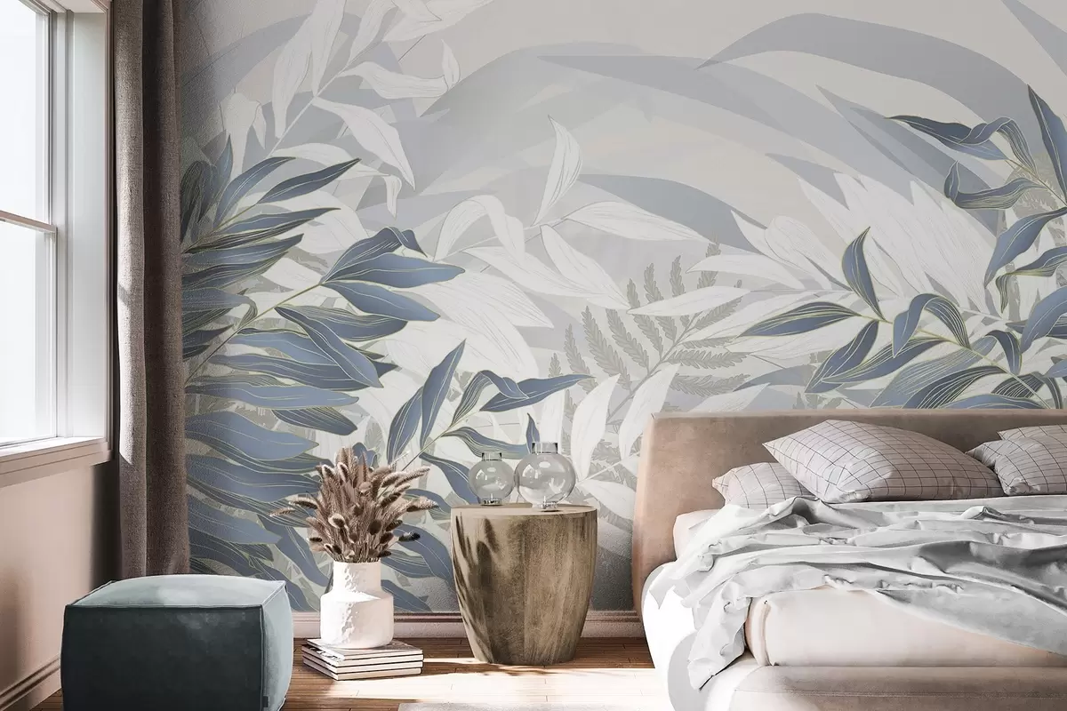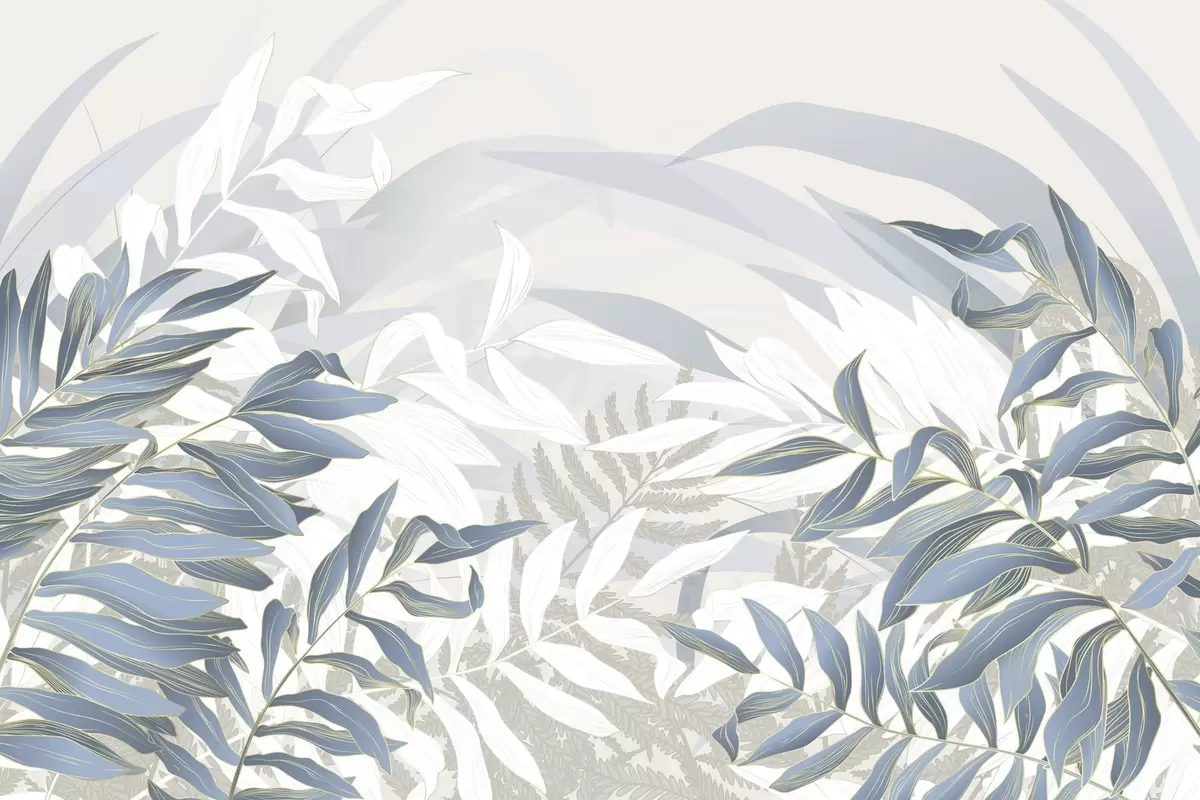 Fototapeter Blå og hvite blader og gress, myke pastellfarger, botanisk illustrasjon, minimalistisk design, dekorativ, moderne Nr. w09341
