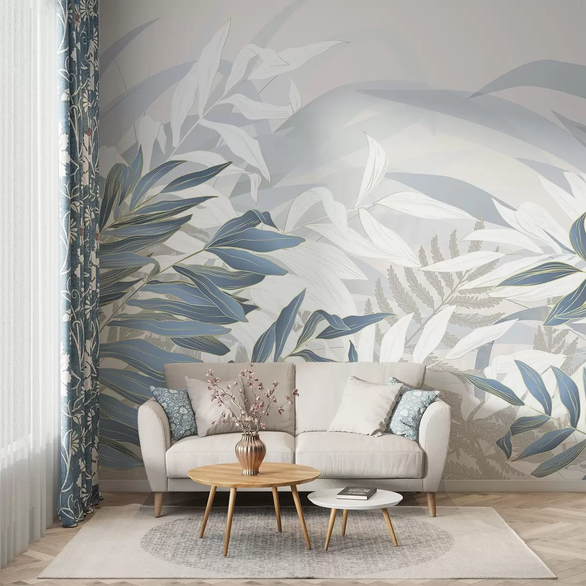 Fototapeter Blå og hvite blader og gress, myke pastellfarger, botanisk illustrasjon, minimalistisk design, dekorativ, moderne Nr. w09341