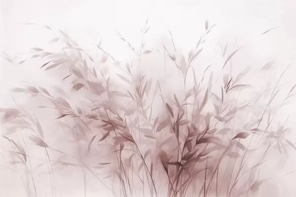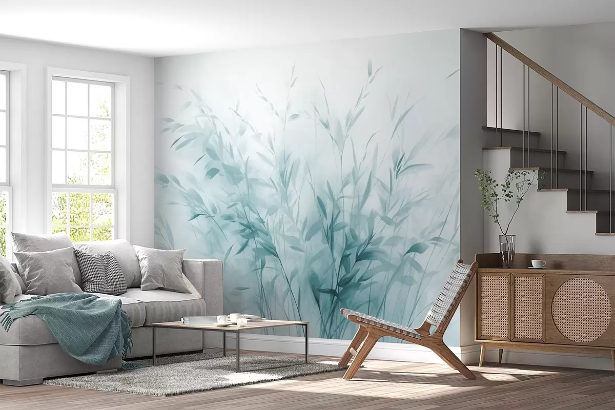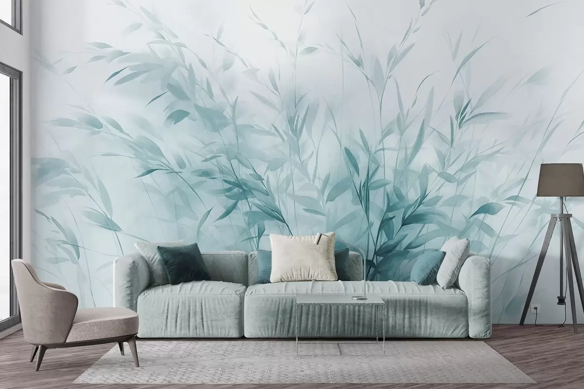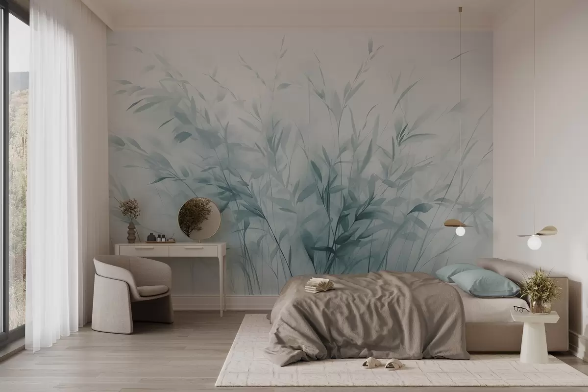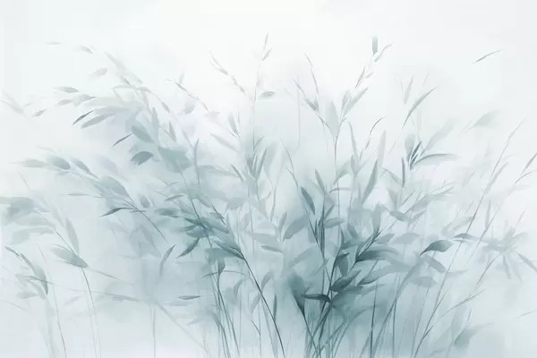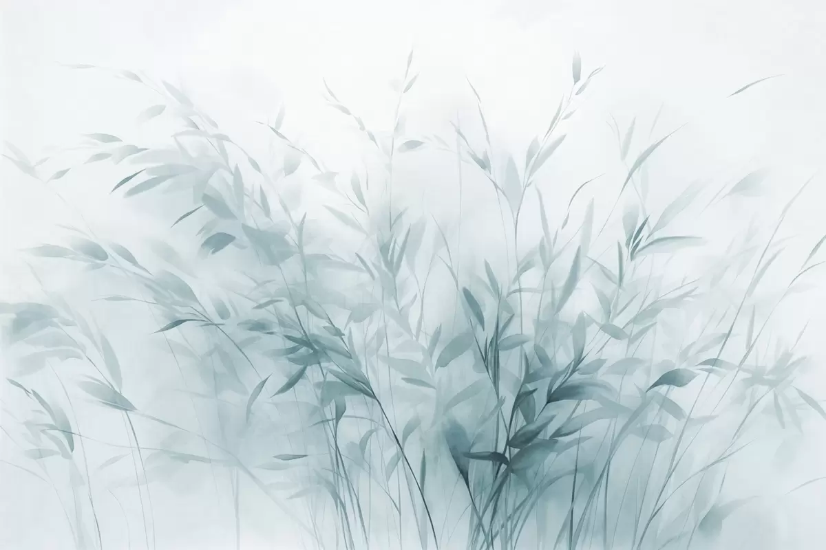 Fototapeter Gress og ugress med tynne blader og stengler, lyseblå farger, myke og delikate penselstrøk, minimalistisk trykk Nr. w09342v1