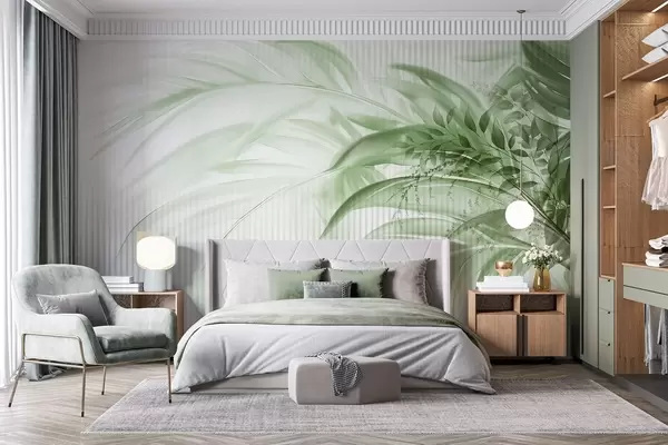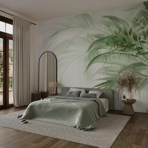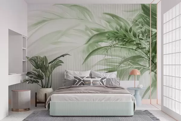 Fototapeter Palme tropiske grønne blader med hvit stripete bakgrunn, myk belysning, delikate penselstrøk, organiske former Nr. w09343