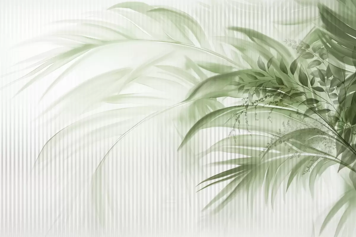 Fototapeter Palme tropiske grønne blader med hvit stripete bakgrunn, myk belysning, delikate penselstrøk, organiske former Nr. w09343