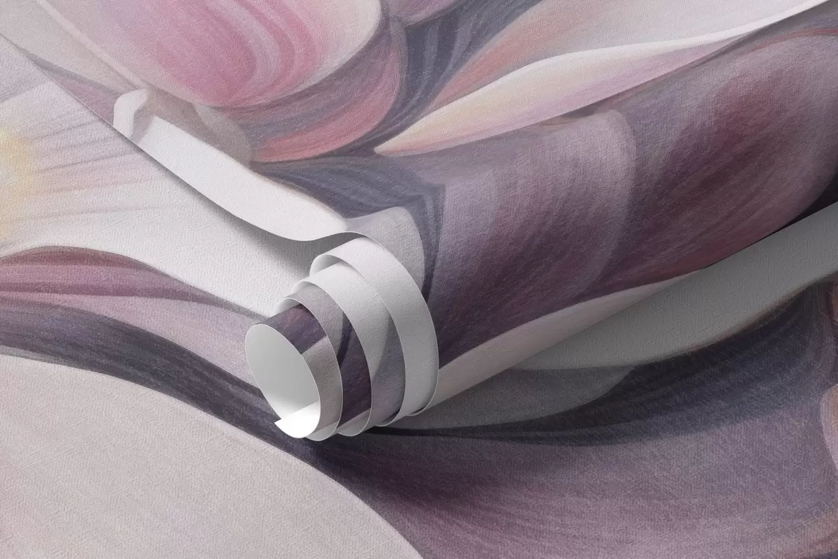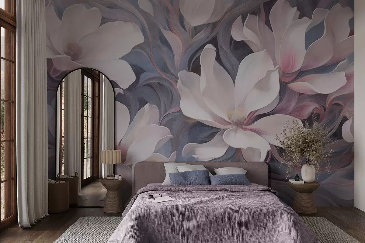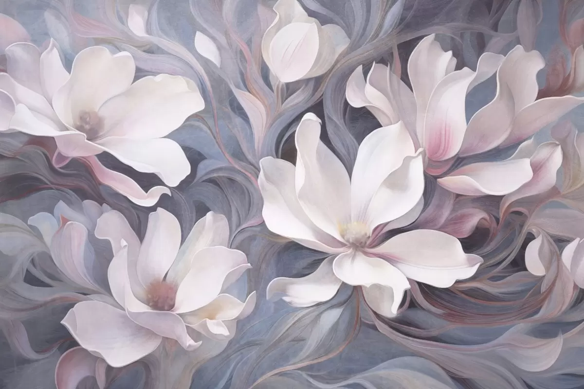 Fototapeter Teksturert maleri av hvite magnoliablomster med rosa aksenter, mot en bakgrunn av virvlende, dempede blå og grå toner Nr. w09344