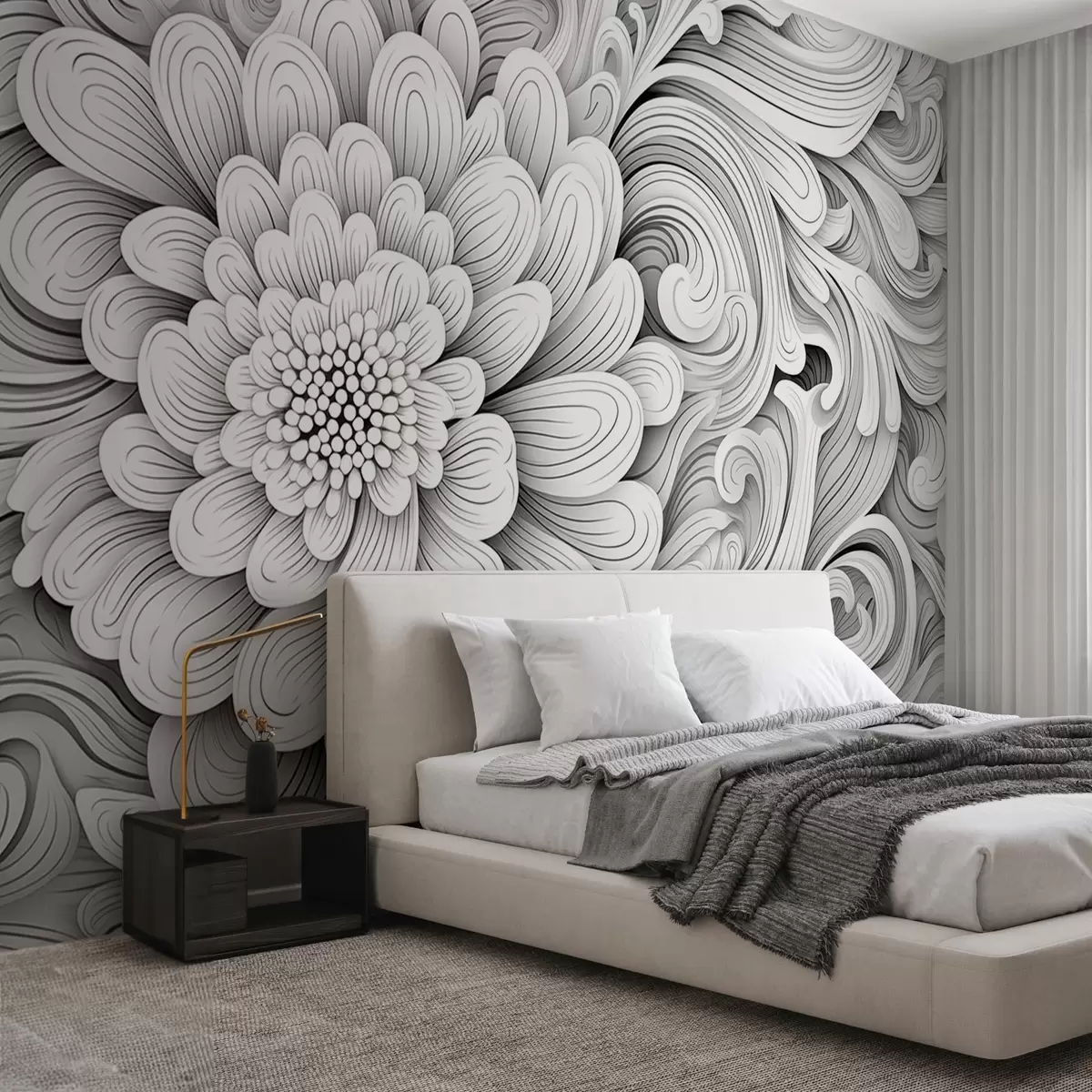 Fototapeter Dekorativt svart-hvitt mønster i form av en blomst og virvler Nr. w09355