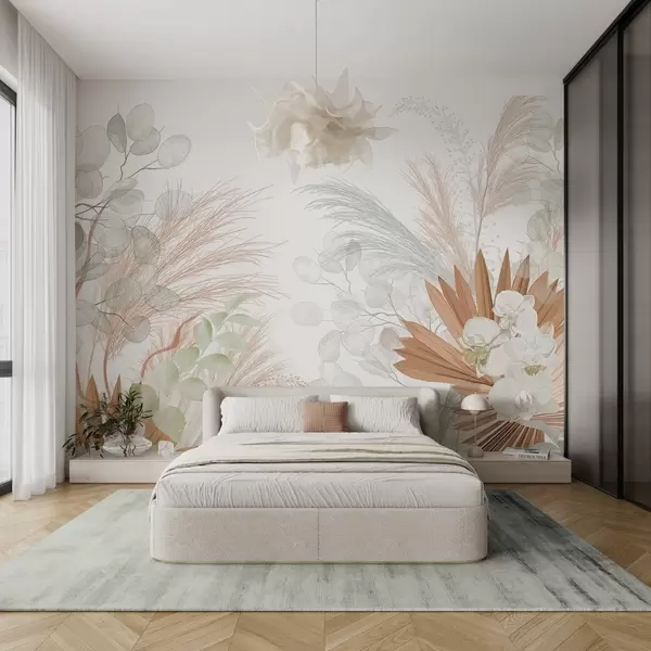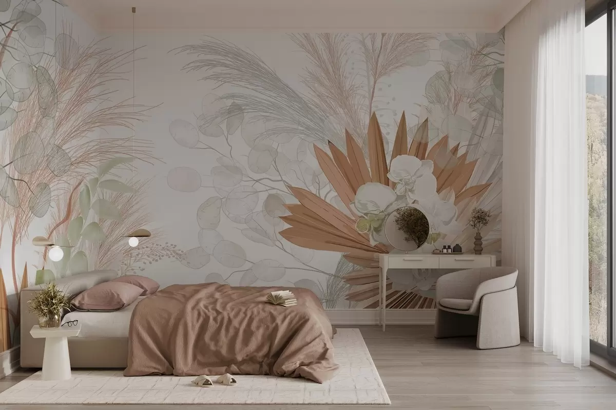 Fototapeter Pampasgress, eukalyptus, tropiske blader og orkideer på hvit bakgrunn, pastellfarger Nr. w09366
