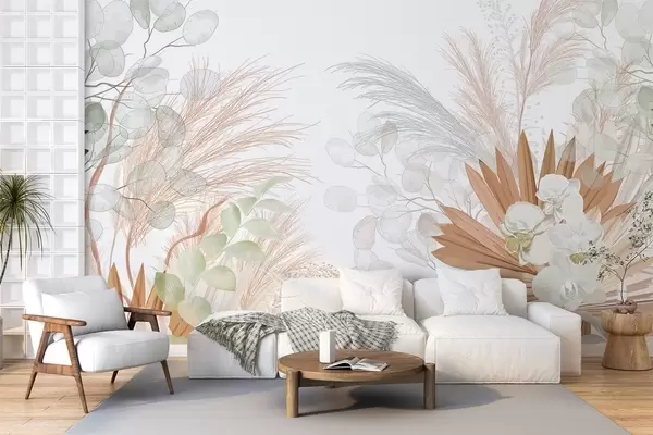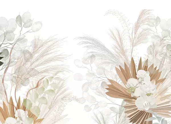Fototapeter Pampasgress, eukalyptus, tropiske blader og orkideer på hvit bakgrunn, pastellfarger Nr. w09366