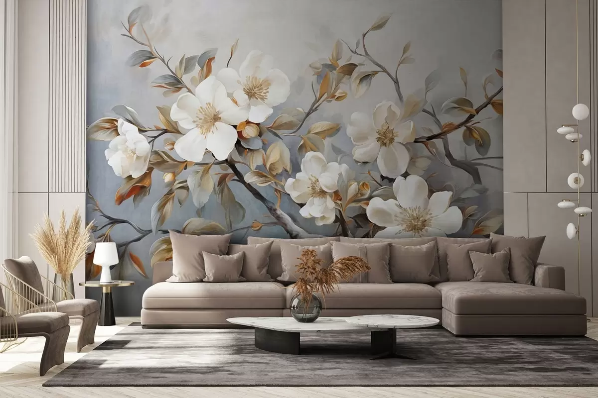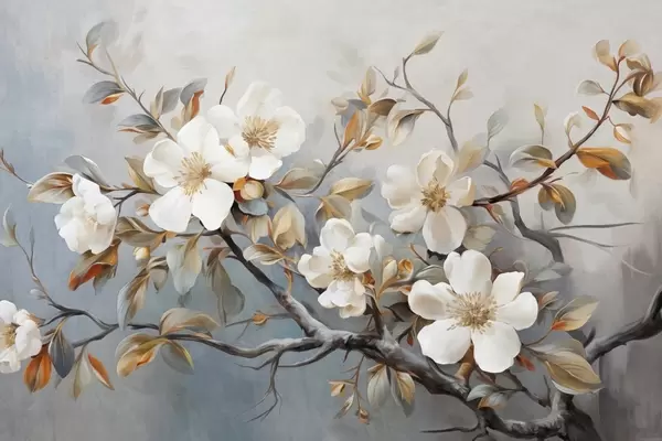 Fototapeter Hvite blomster med gule pistiller på en tregren med blader, lys bakgrunn, vintage maleristil, teksturert trykk Nr. w09368