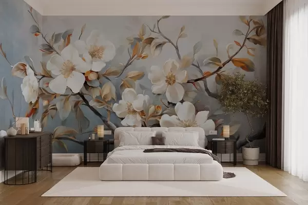 Fototapeter Hvite blomster med gule pistiller på en tregren med blader, lys bakgrunn, vintage maleristil, teksturert trykk Nr. w09368