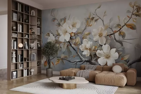 Fototapeter Hvite blomster med gule pistiller på en tregren med blader, lys bakgrunn, vintage maleristil, teksturert trykk Nr. w09368
