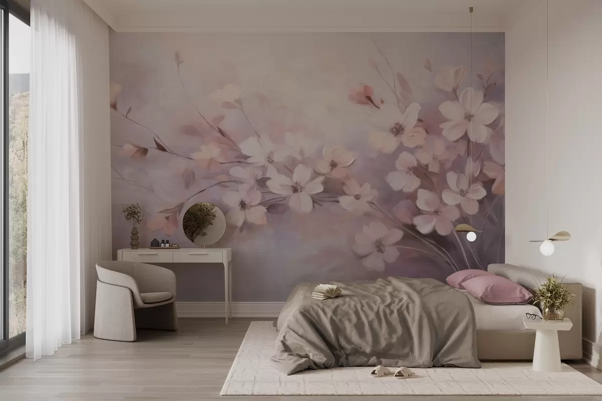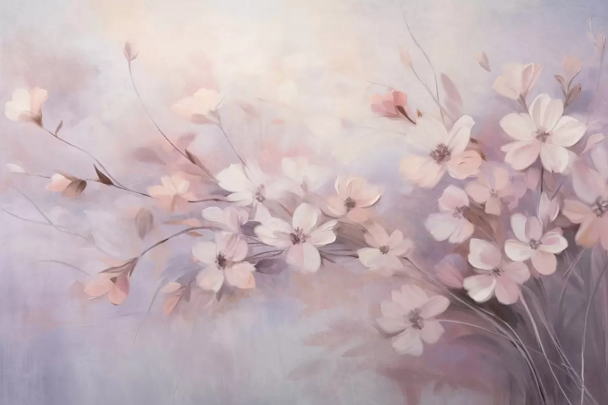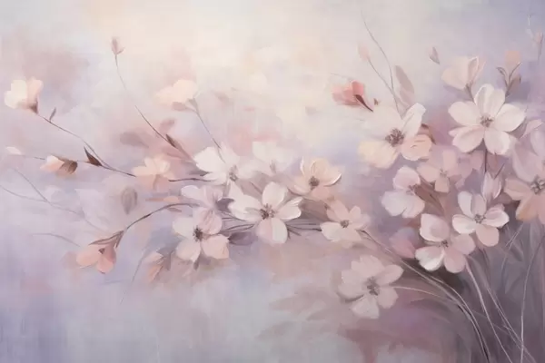 Fototapeter Et blomsterarrangement med delikate blomster med myke, uskarpe kanter, mot en pastellfarget bakgrunn av lavendel og lys rosa fargetoner Nr. w09369