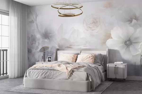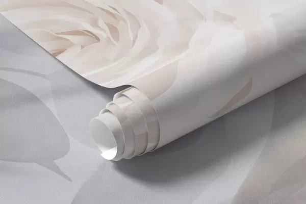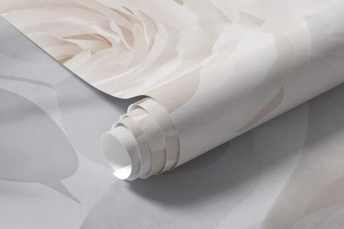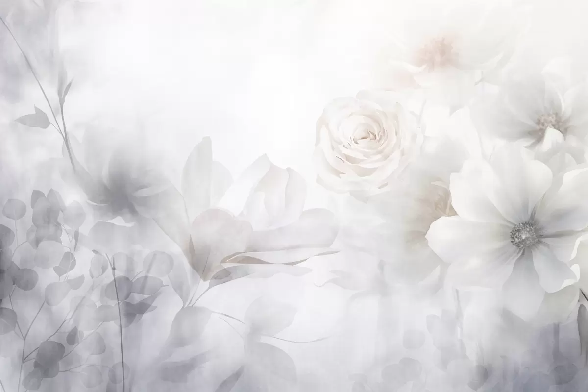 Fototapeter Et delikat abstrakt blomsterarrangement med pastellrosa roser og magnoliaer, mykt fokus, lysegrå bakgrunn Nr. w09371