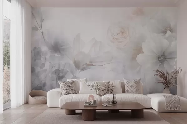 Fototapeter Et delikat abstrakt blomsterarrangement med pastellrosa roser og magnoliaer, mykt fokus, lysegrå bakgrunn Nr. w09371