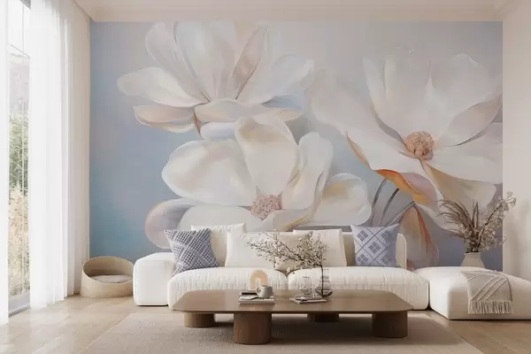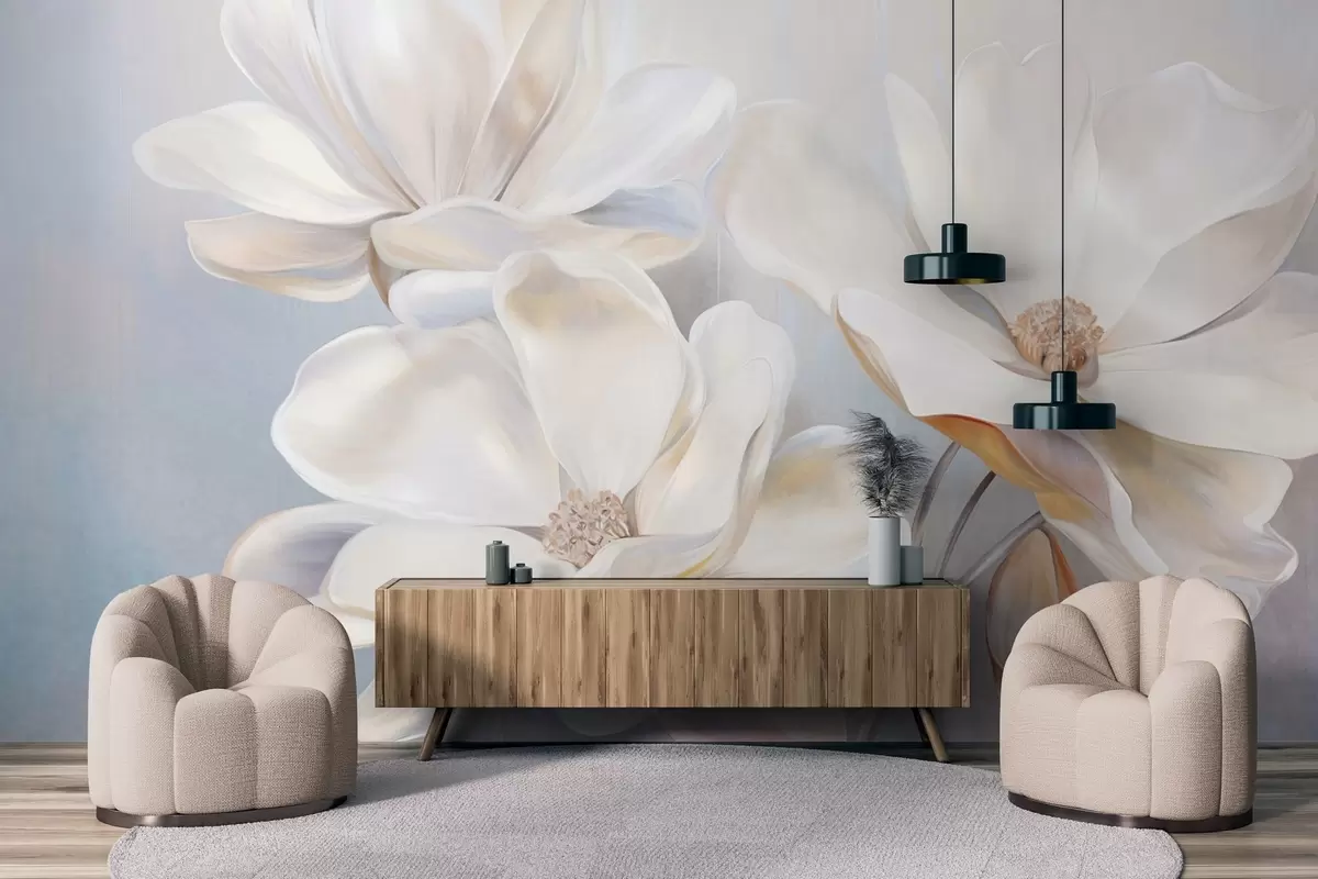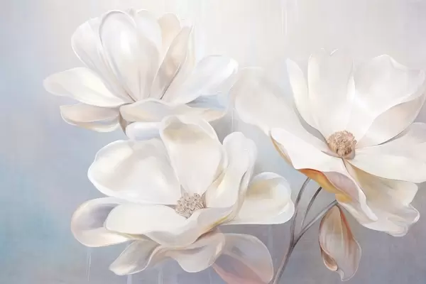 Fototapeter Hvite fantasifulle magnoliablomster med delikate, strukturerte kronblader og en myk, abstrakt bakgrunn. Nr. w09373