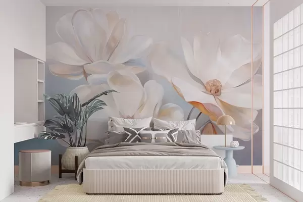 Fototapeter Hvite fantasifulle magnoliablomster med delikate, strukturerte kronblader og en myk, abstrakt bakgrunn. Nr. w09373