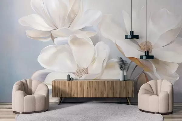 fototapeter Hvite fantasifulle magnoliablomster med delikate, strukturerte kronblader og en myk, abstrakt bakgrunn. w09373