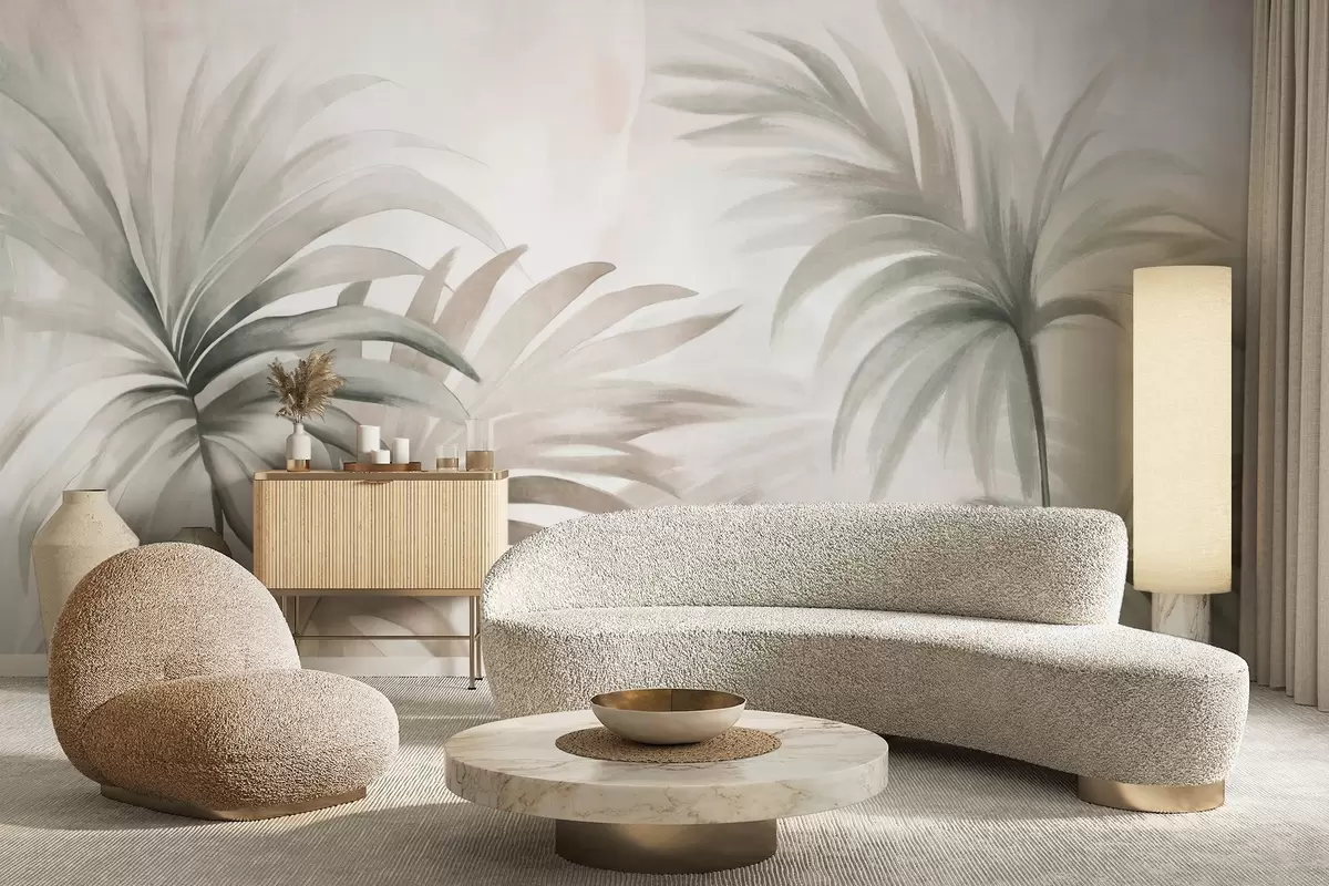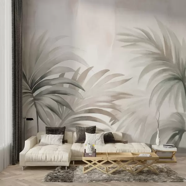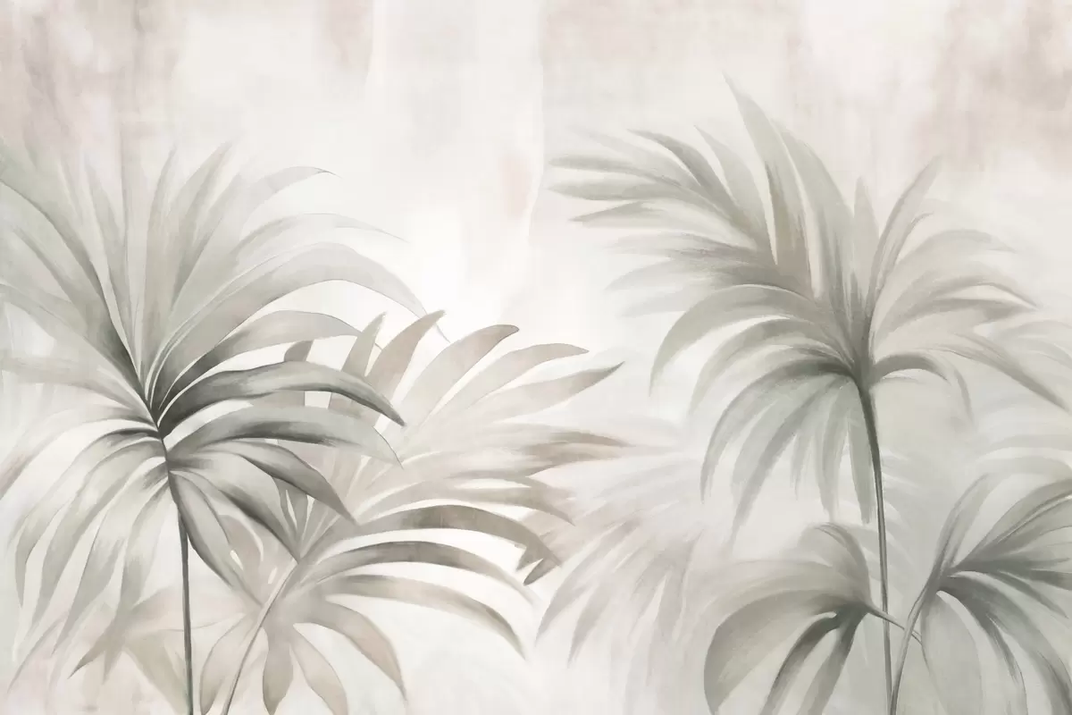 Fototapeter Palmetre teksturerte blader i nøytrale farger, beige abstrakt bakgrunn, myke penselstrøk, tropisk teksturert løvverk Nr. w09380