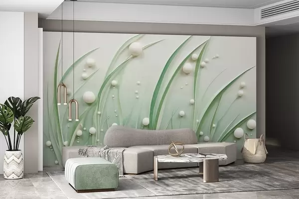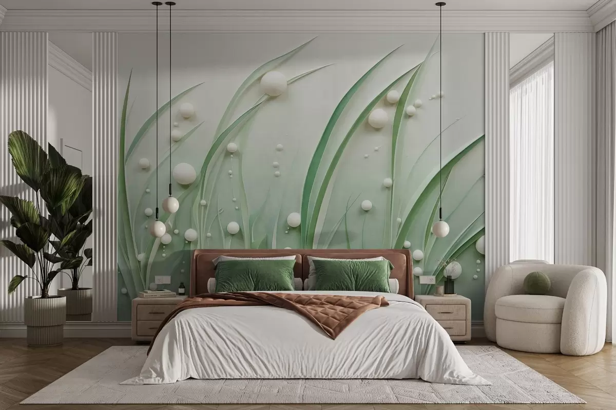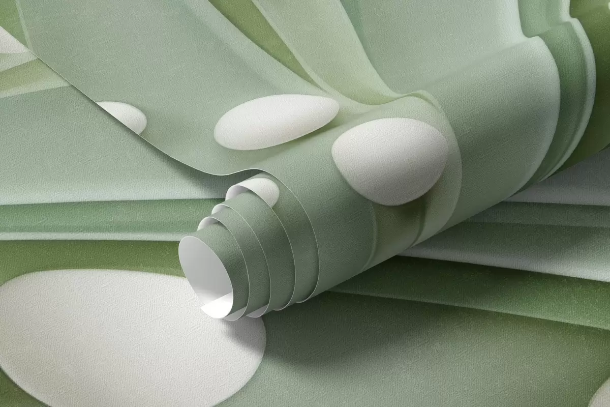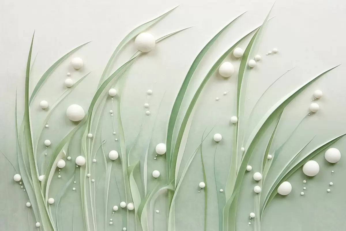 Fototapeter Abstrakt grønt gress med hvite kuler, lysegrønn bakgrunn, strukturert, rene linjer, minimalistisk stil Nr. w09382