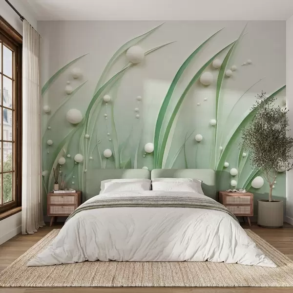 Fototapeter Abstrakt grønt gress med hvite kuler, lysegrønn bakgrunn, strukturert, rene linjer, minimalistisk stil Nr. w09382