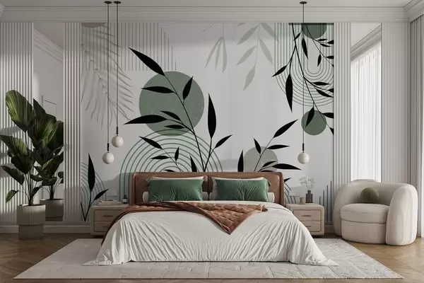 Fototapeter Teksturert, abstrakt trykk med geometriske former, sirkler og buer samt svarte og grønne planter på hvit bakgrunn Nr. w09384