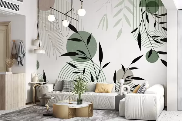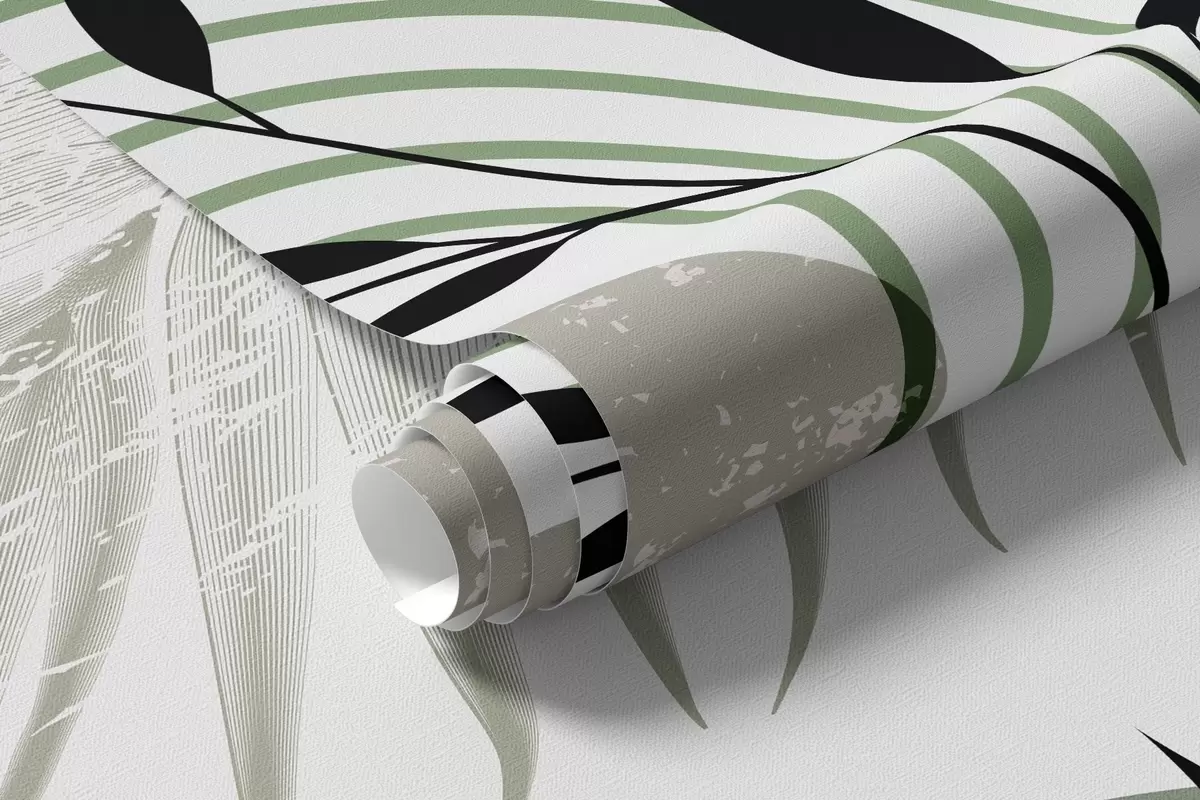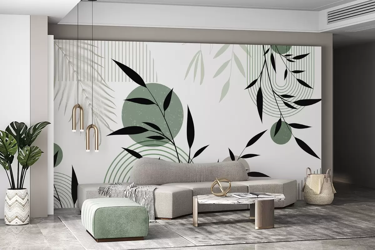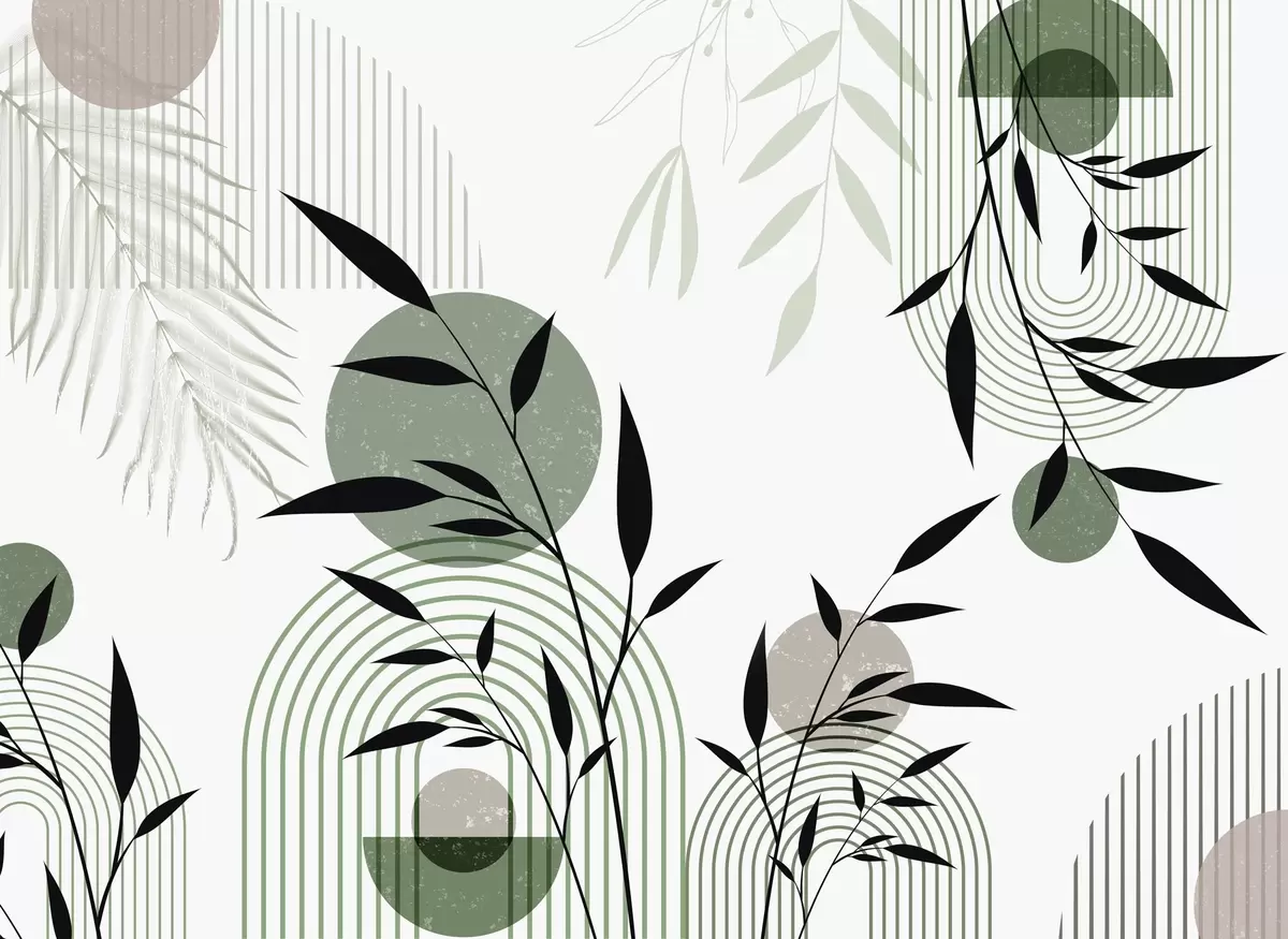 Fototapeter Teksturert, abstrakt trykk med geometriske former, sirkler og buer samt svarte og grønne planter på hvit bakgrunn Nr. w09384