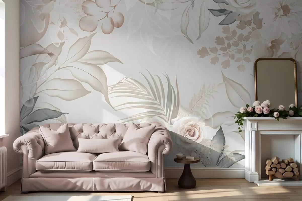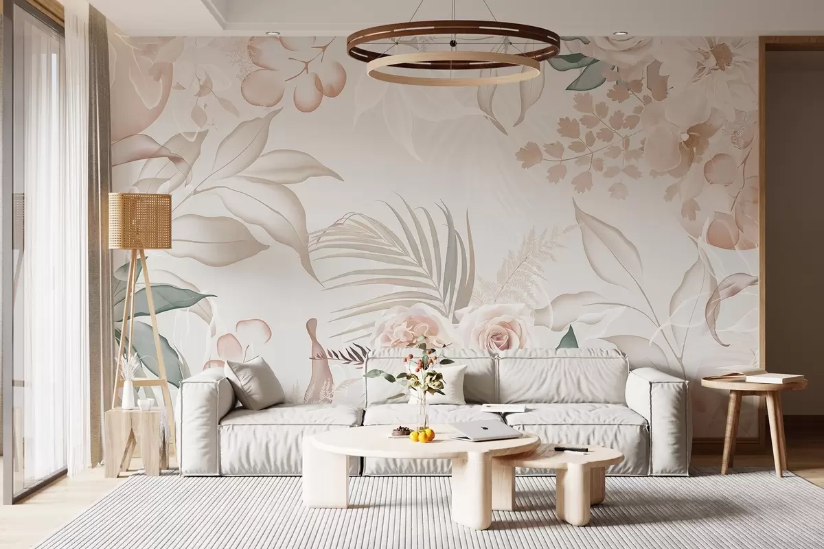 Fototapeter Blomsterarrangement med roser, orkideer, eukalyptus og palmeblader i pastellfarger, beige bakgrunn Nr. w09393