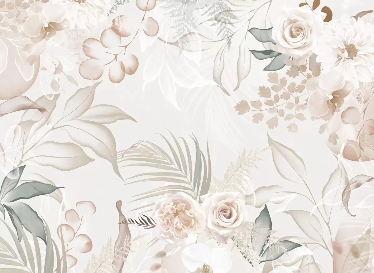 Fototapeter Blomsterarrangement med roser, orkideer, eukalyptus og palmeblader i pastellfarger, beige bakgrunn Nr. w09393